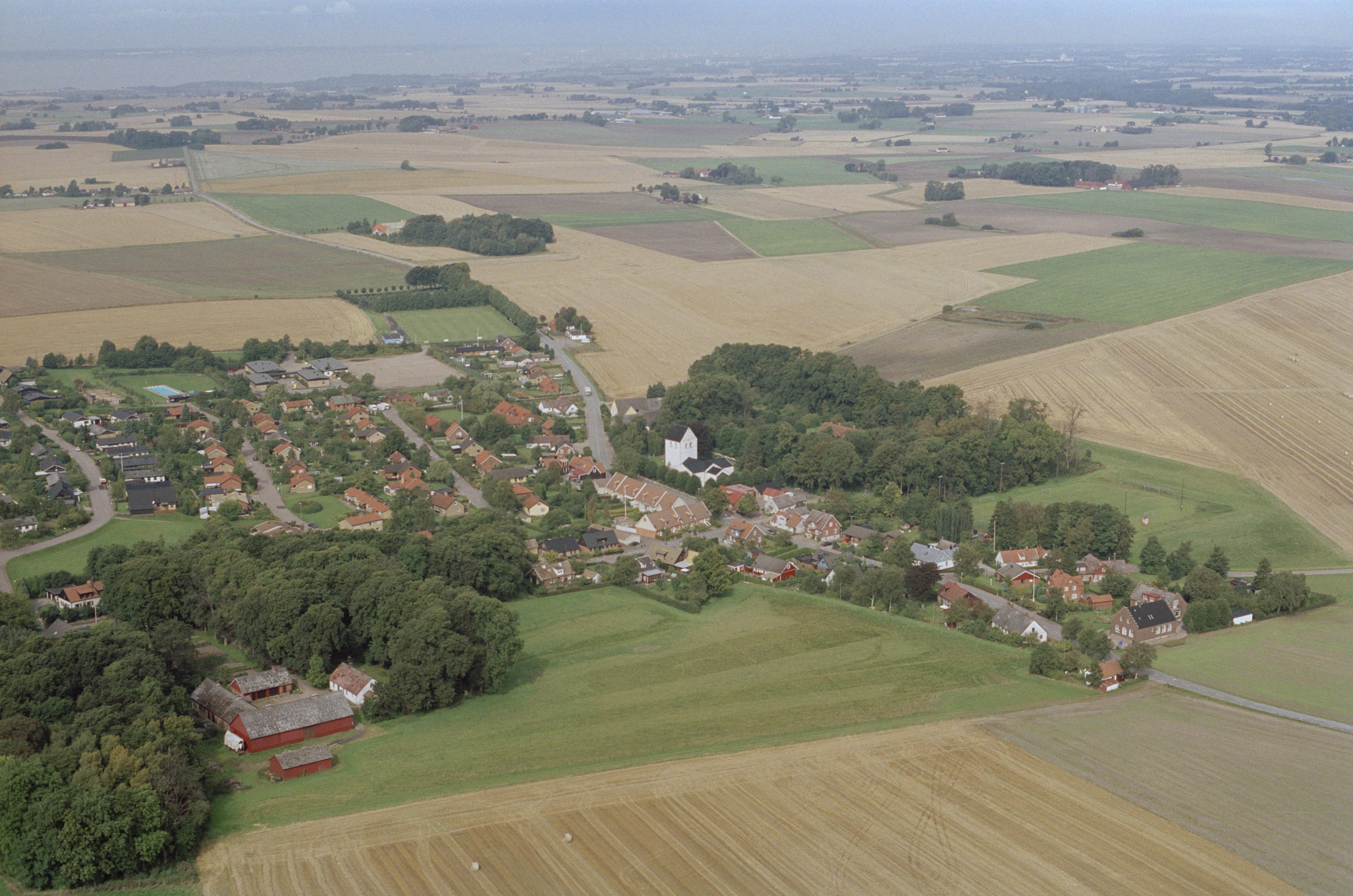Beskrivning: Härslövs kyrka och kyrkby. Bilden är tagen mot (väderstreck): NV