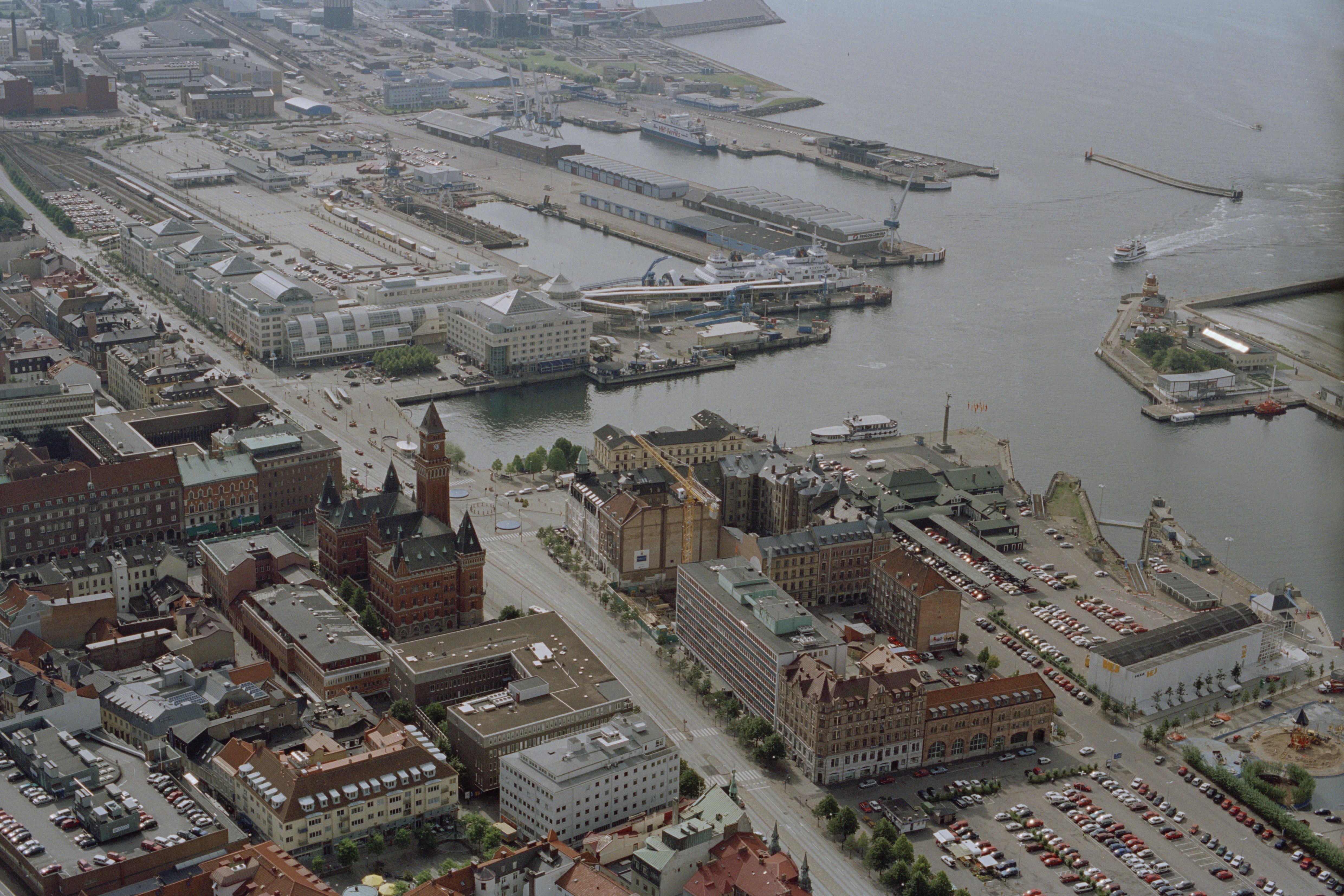 Beskrivning: Helsingborgs stad. Helsingborgs rådhus till vänster om bildens mitt. Bilden är tagen mot (väderstreck): SO
