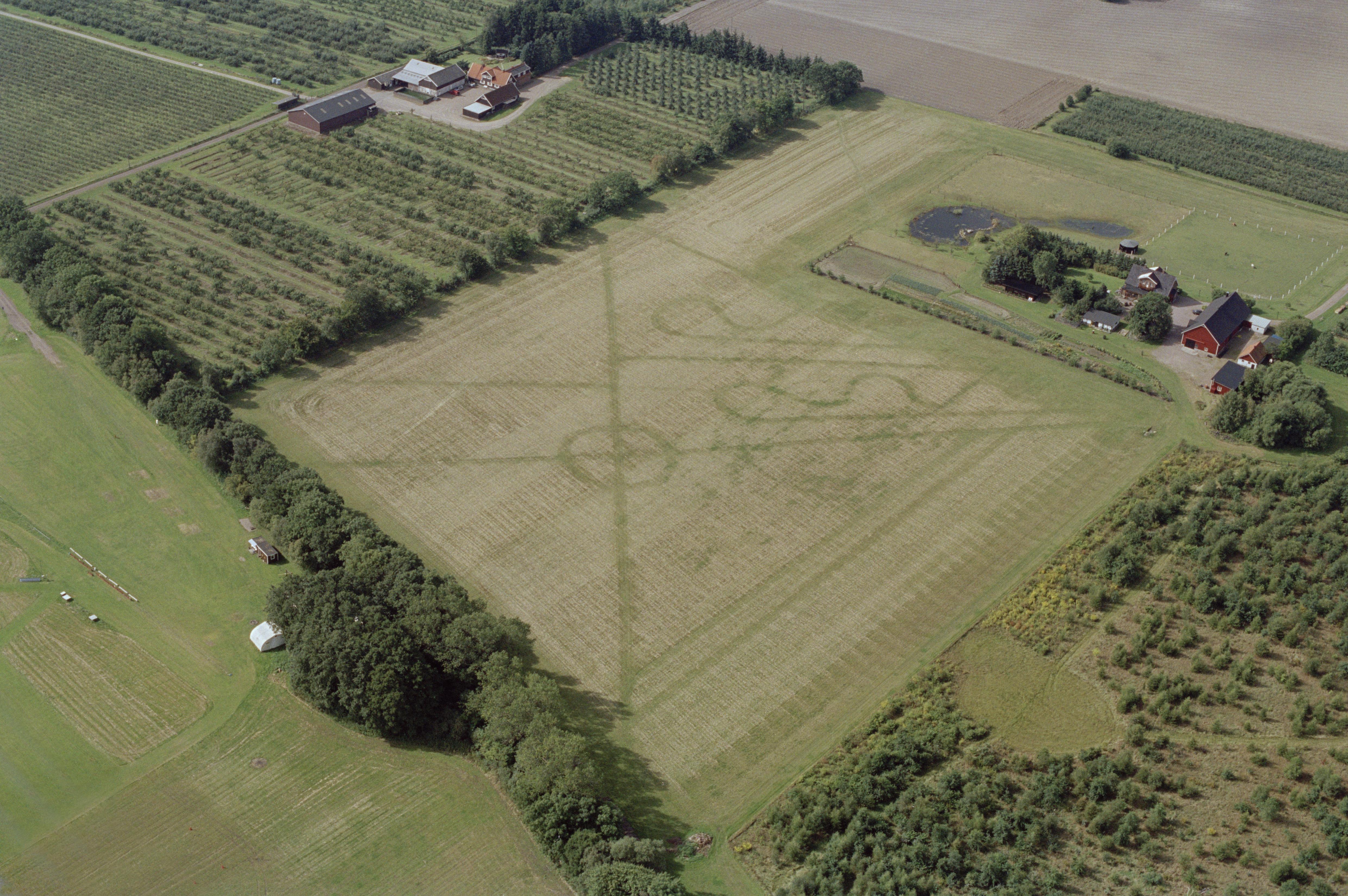 Beskrivning: Modellflygfält vid gränsen mellan socknen Kropp (nere t.v.), Välluv (uppe t.v.) och Helsingborg (bildens övre del). Gården Djupadal till höger om bildens mitt. Bilden är tagen mot (väderstreck): SV