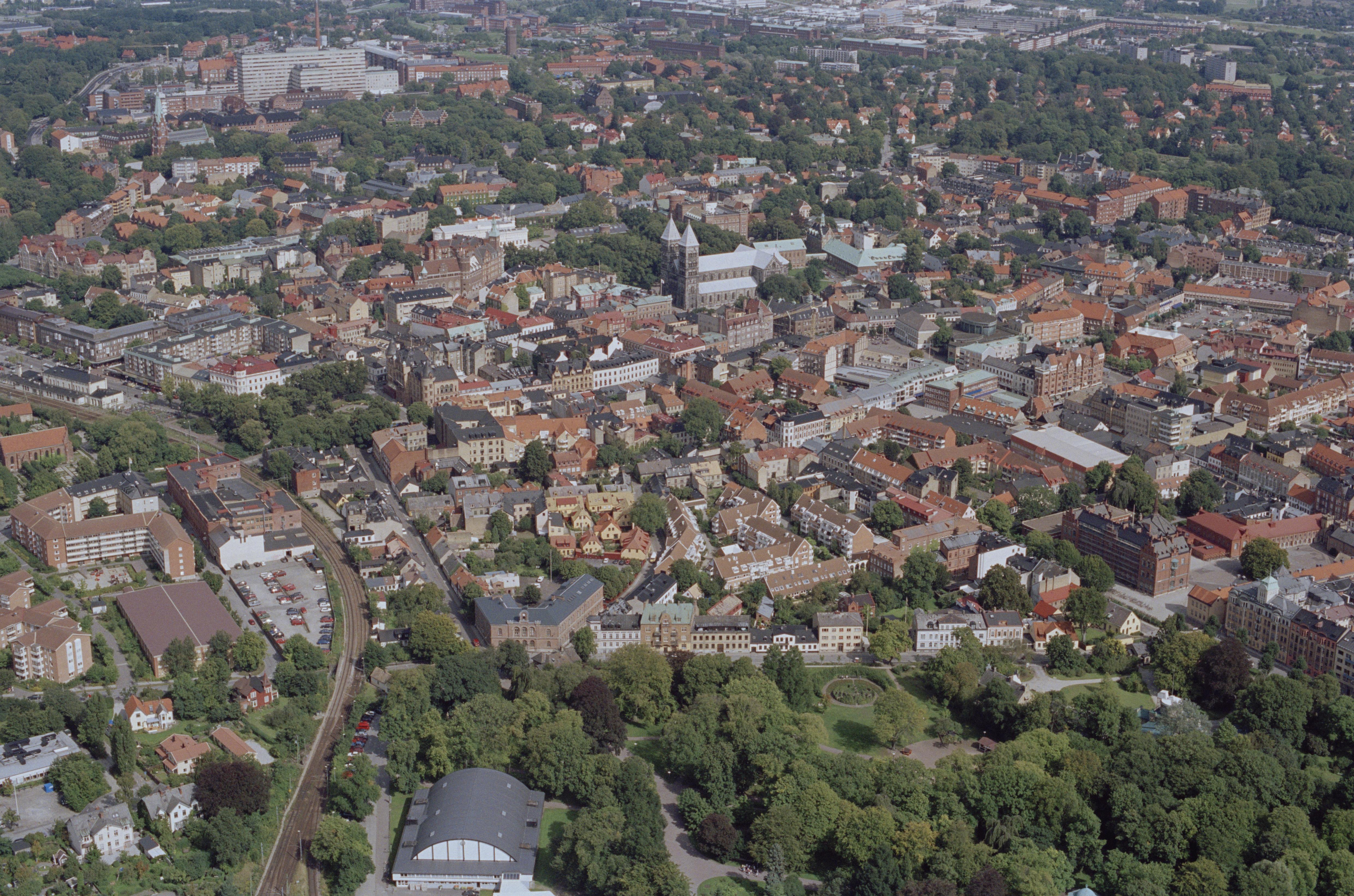 Beskrivning: Lunds stad. Lunds domkyrka över bildens mitt. Bilden är tagen mot (väderstreck): NO