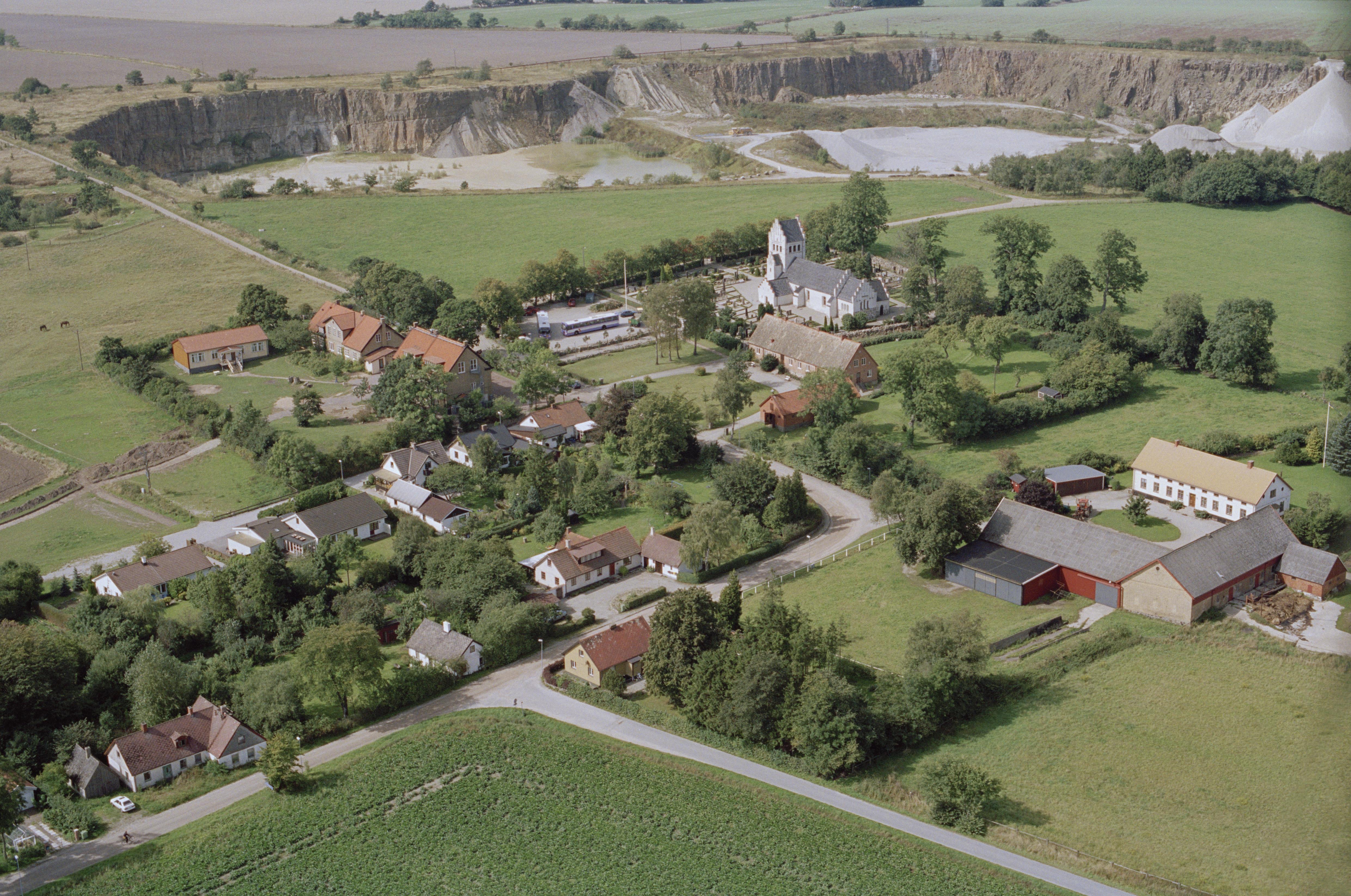 Beskrivning: Hardeberga kyrka och kyrkby. I bildens övre del Norretorp bergtäkt / stenindustri vid gränsen mellan socknen Hardeberga och Södra Sandby. Bilden är tagen mot (väderstreck): NNV