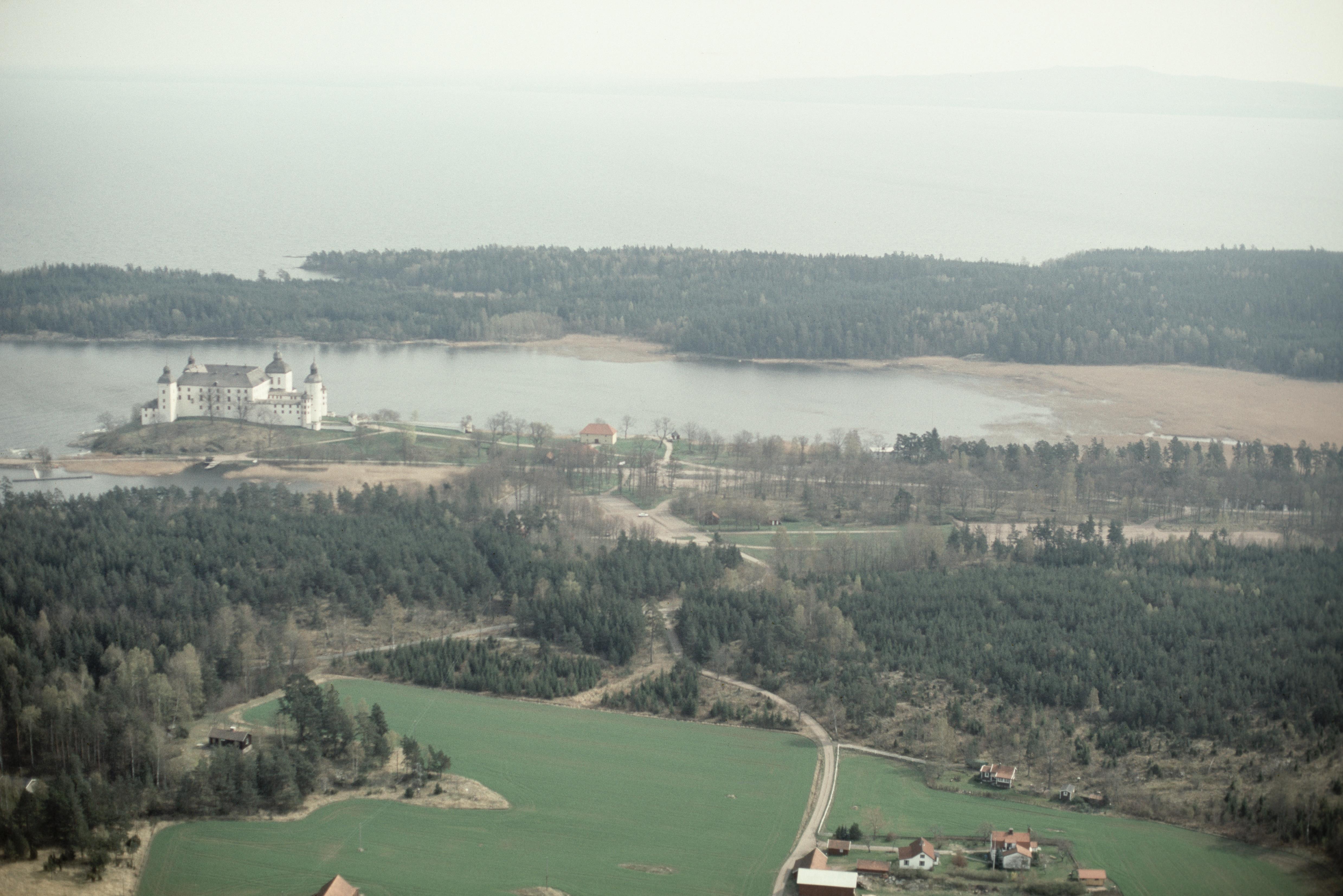 Beskrivning: Läckö slott på Kållandsö vid sjön Vänern. I bildens övre del Kinnekulle. Bilden är tagen mot (väderstreck): OSO