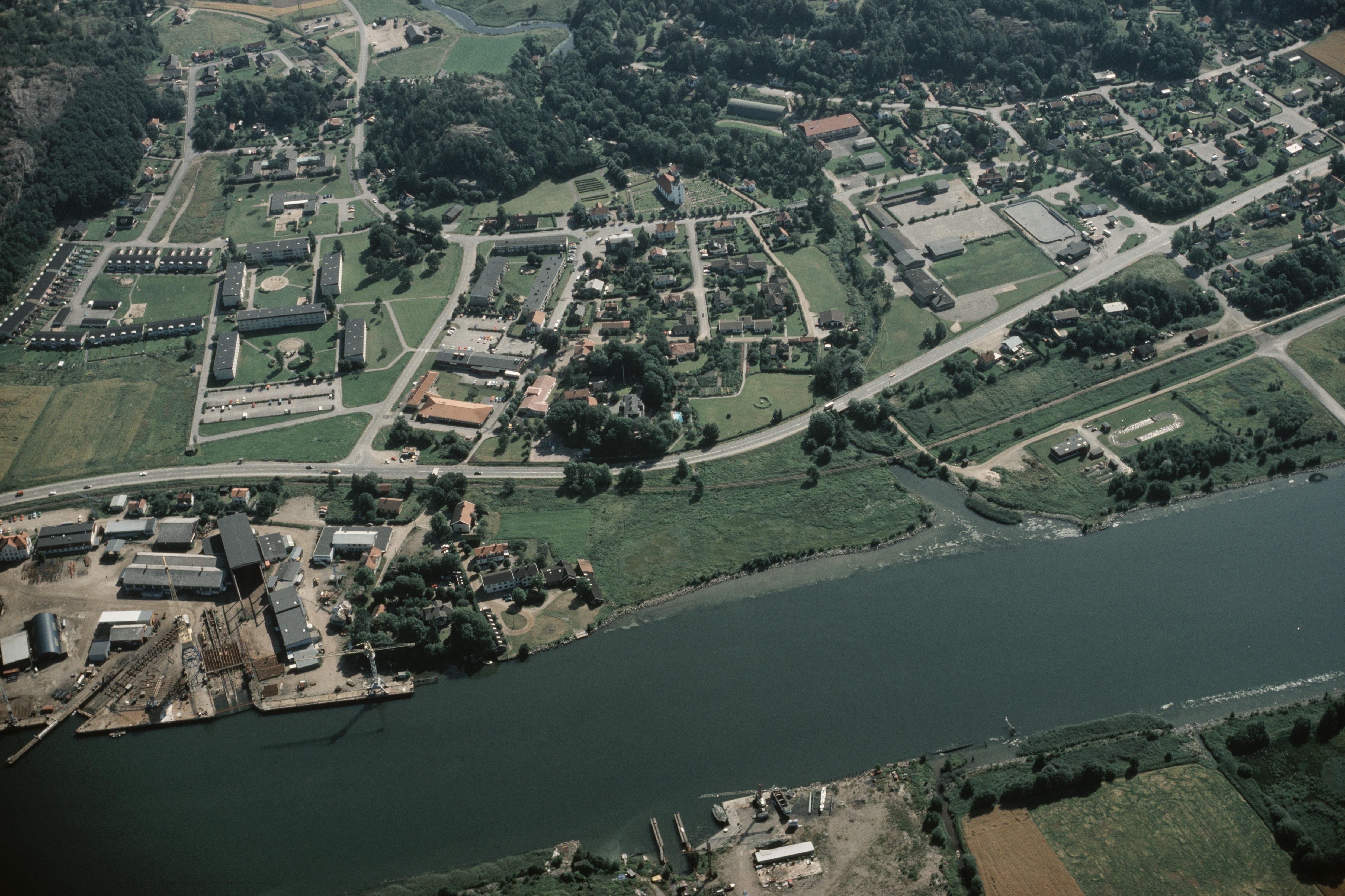 Beskrivning: Lödöse tätort vid Göta älv. Sankt Peders kyrka vid bildens mitt. Bilden är tagen mot (väderstreck): Ö