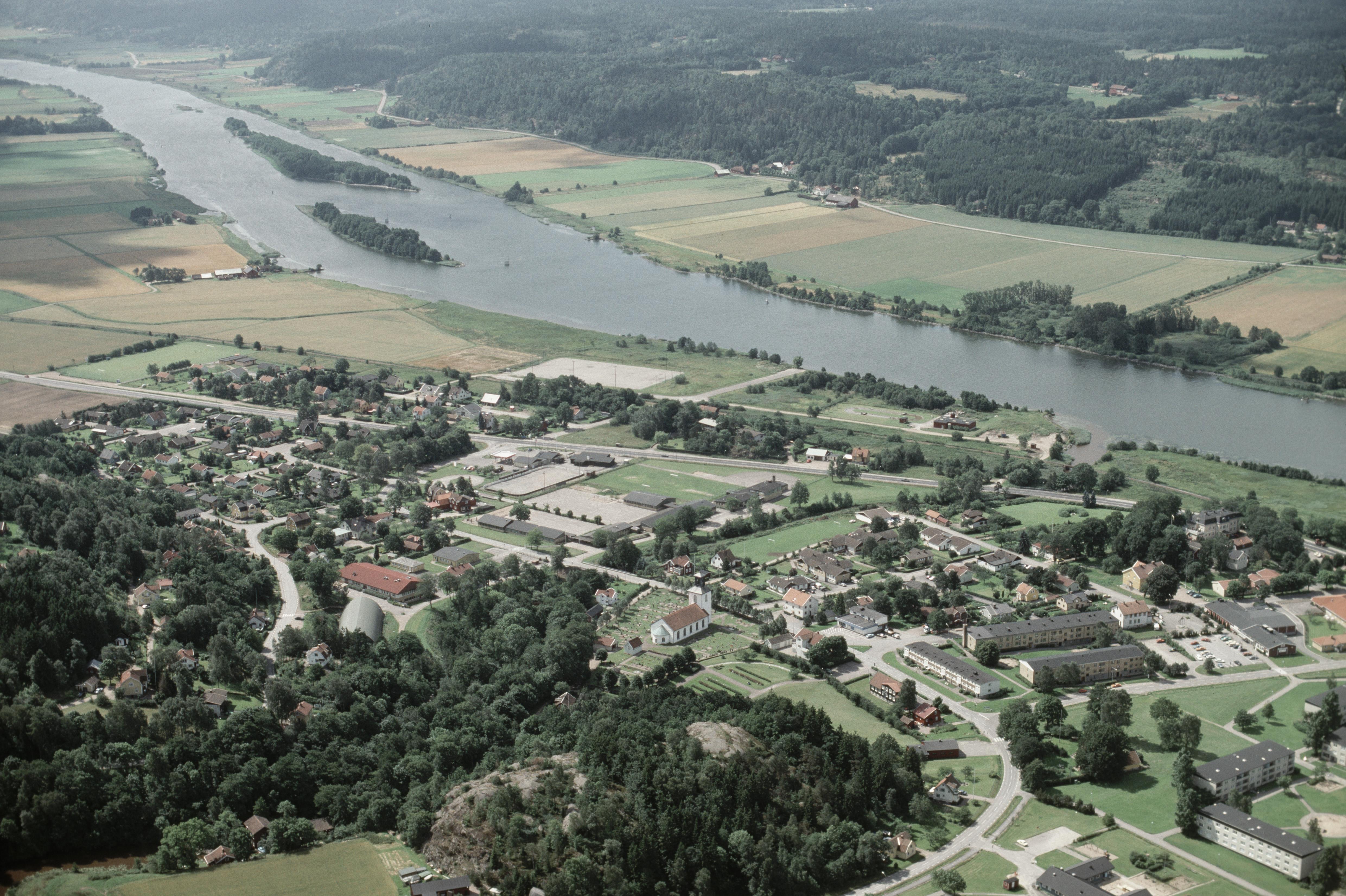 Beskrivning: Lödöse tätort vid Göta älv. Sankt Peders kyrka till vänster om bildens mitt. Bilden är tagen mot (väderstreck): SV