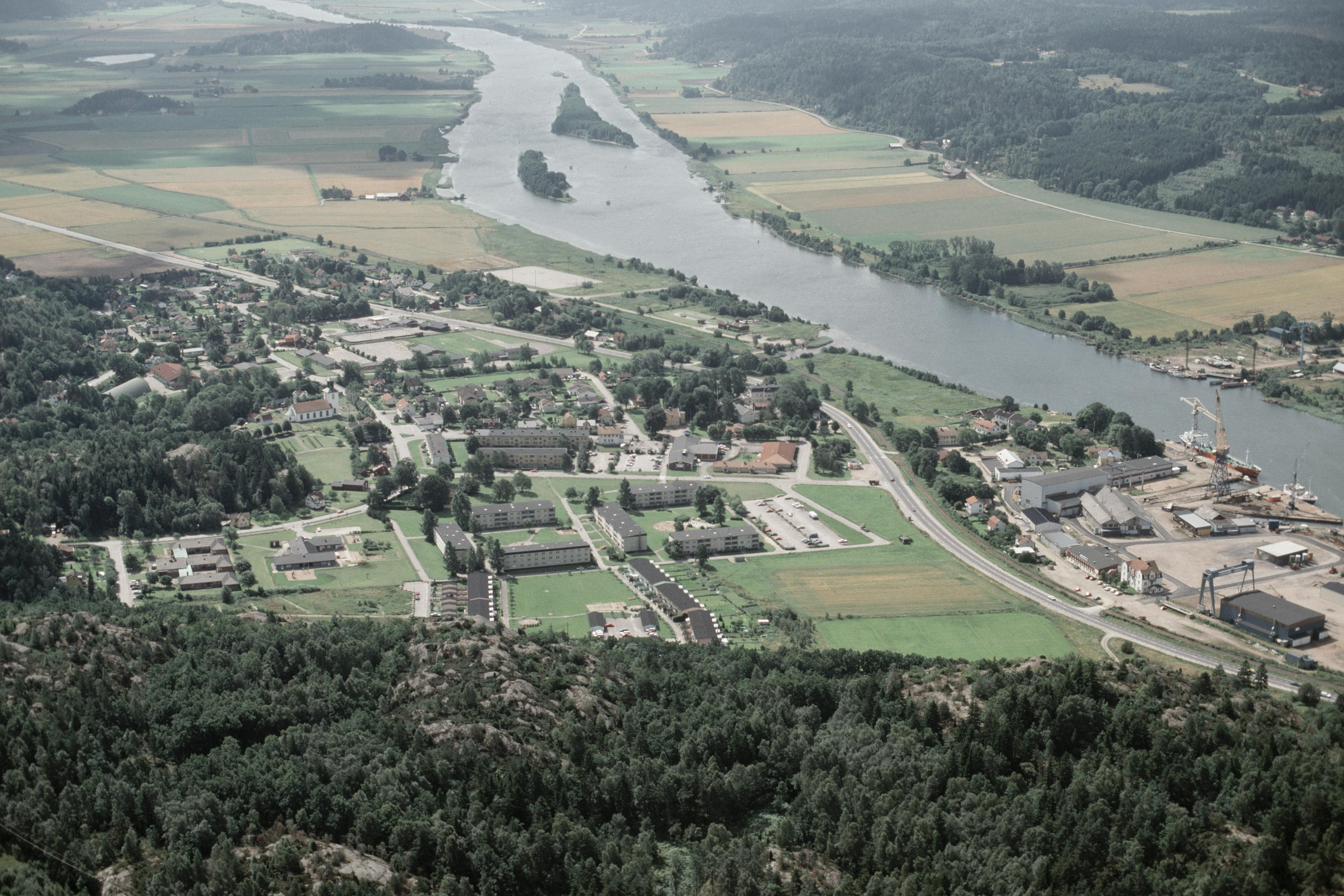 Beskrivning: Lödöse tätort vid Göta älv. Sankt Peders kyrka till vänster om bildens mitt. Bilden är tagen mot (väderstreck): S