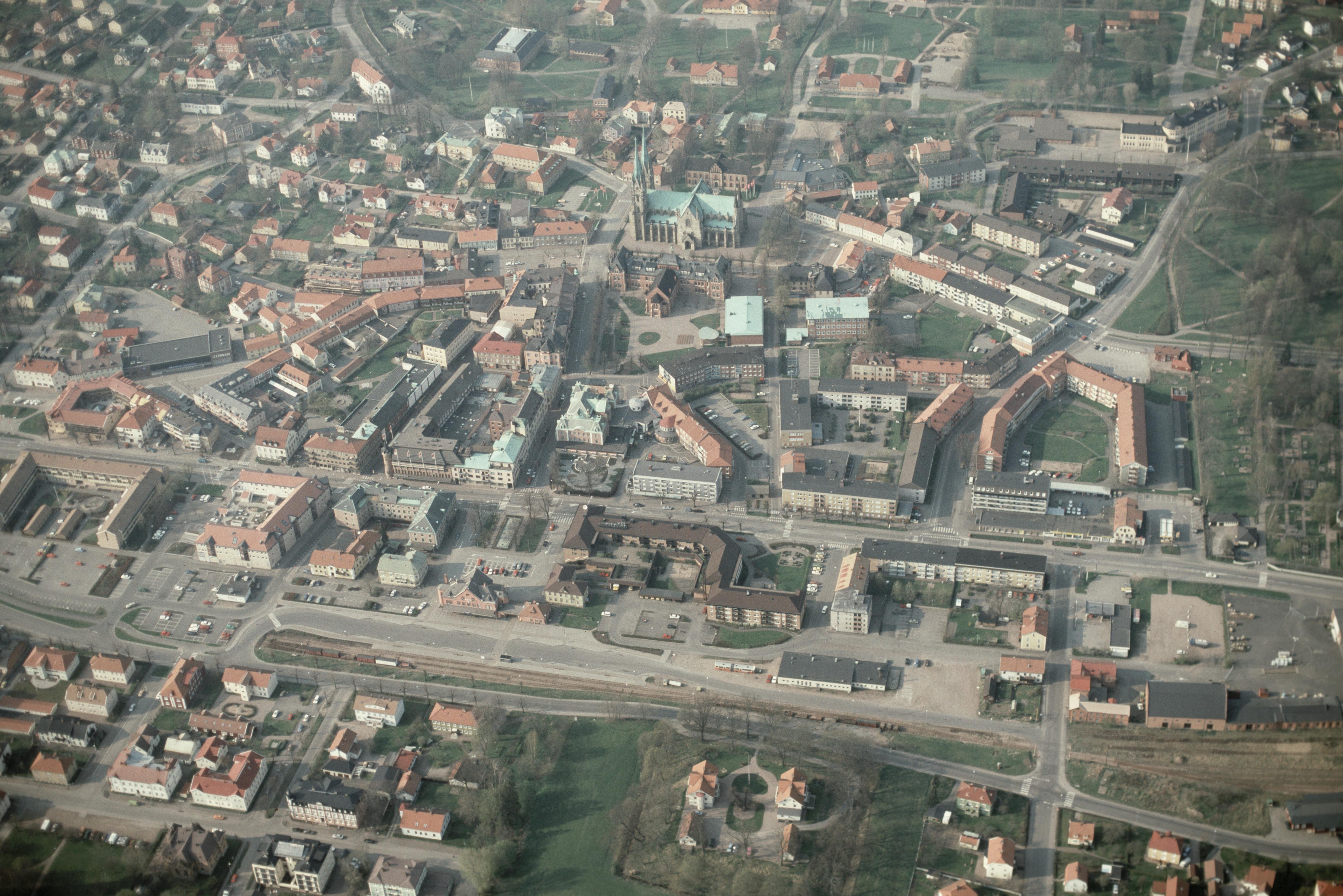 Beskrivning: Skara stad. Skara domkyrka (Sankta Maria) i bildens övre del. Bilden är tagen mot (väderstreck): SSV