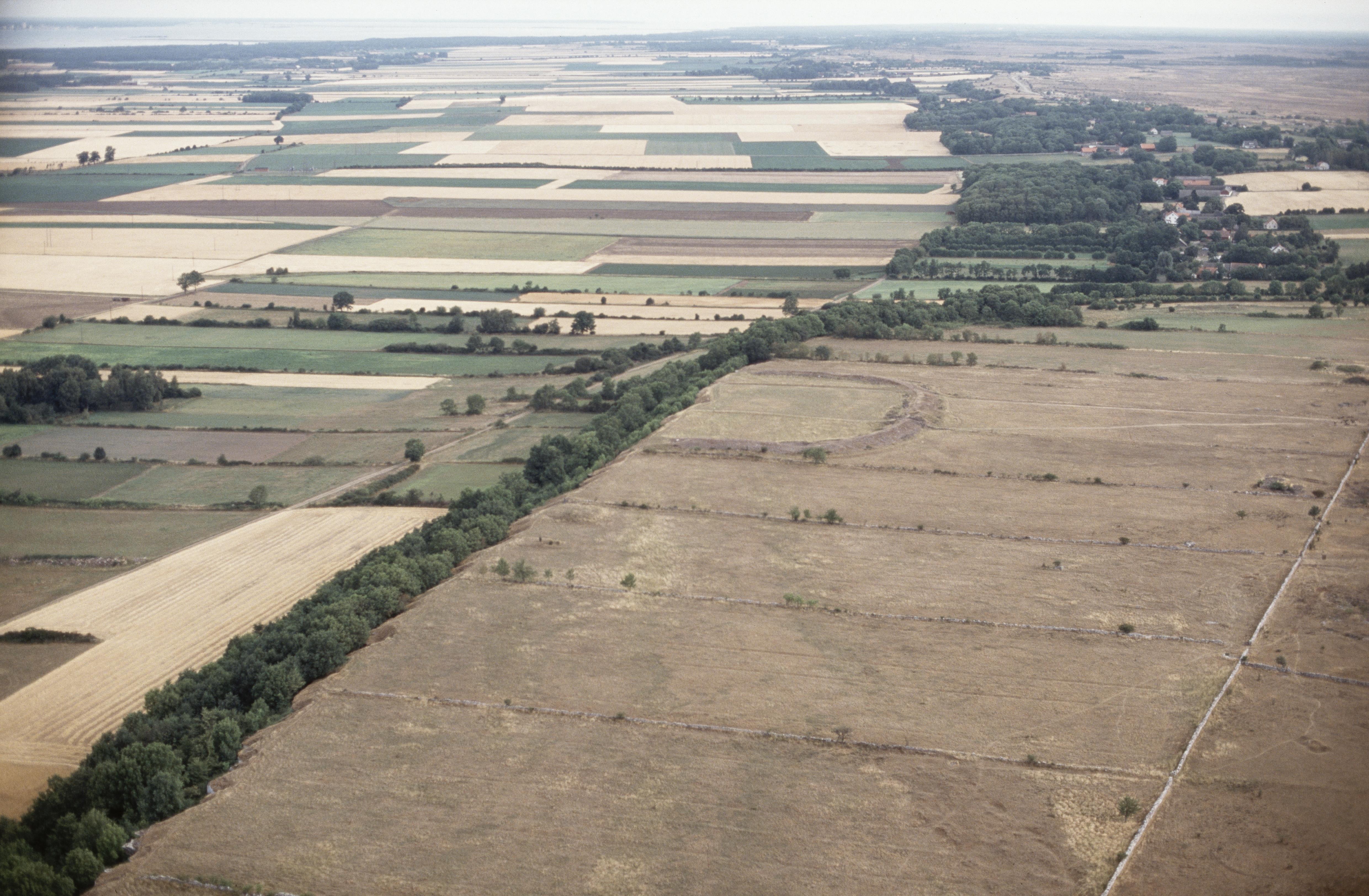 Beskrivning: Alvaret. Fornborg Bårbyborg / Bårby borg RAÄnr Mörbylånga 17:1 vid bildens mitt. I bildens övre del byarna Södra och Norra Bårby. Bilden är tagen mot (väderstreck): NV