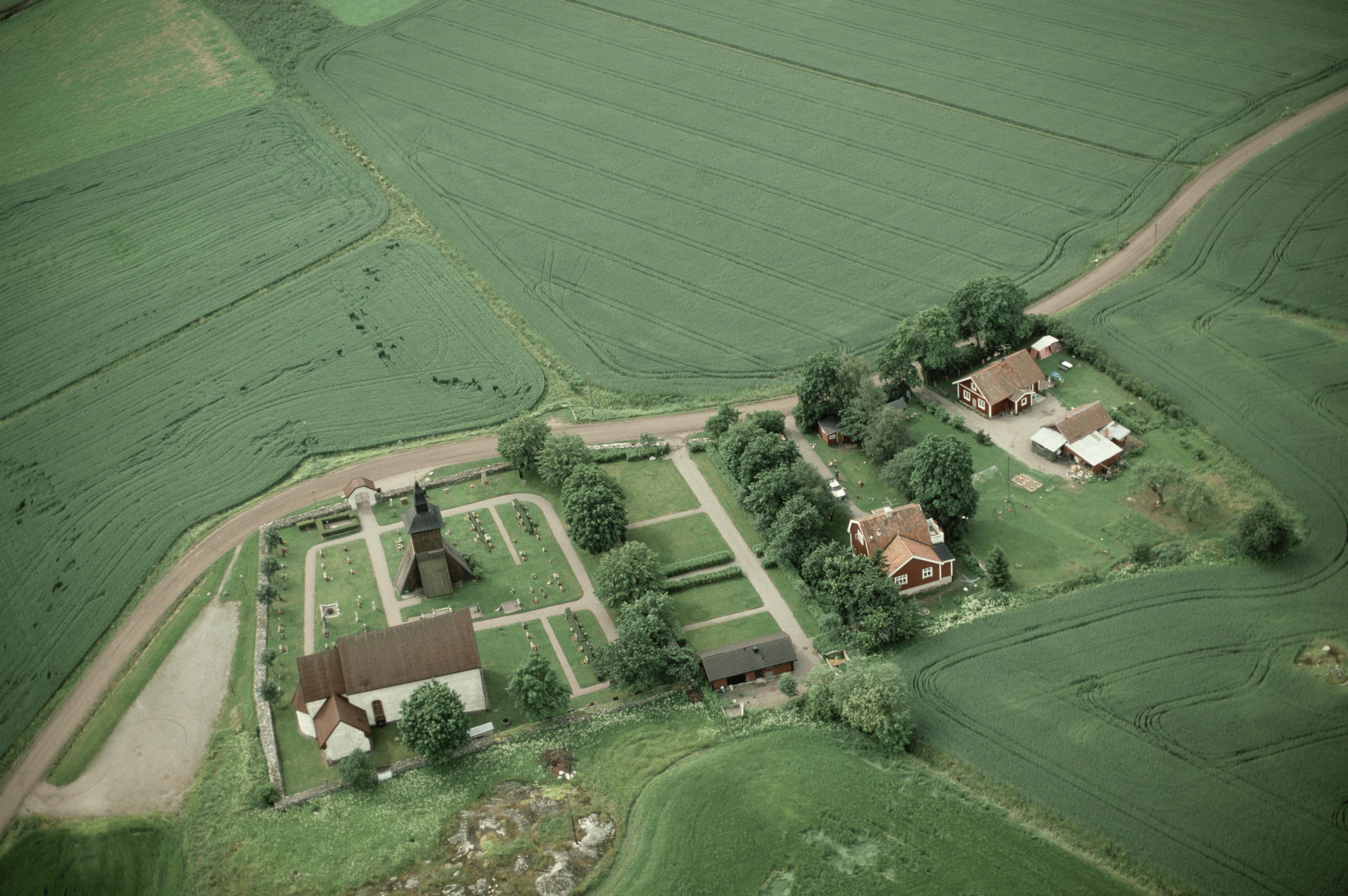 Beskrivning: Orkesta kyrka och kyrkby. Bilden är tagen mot (väderstreck): S