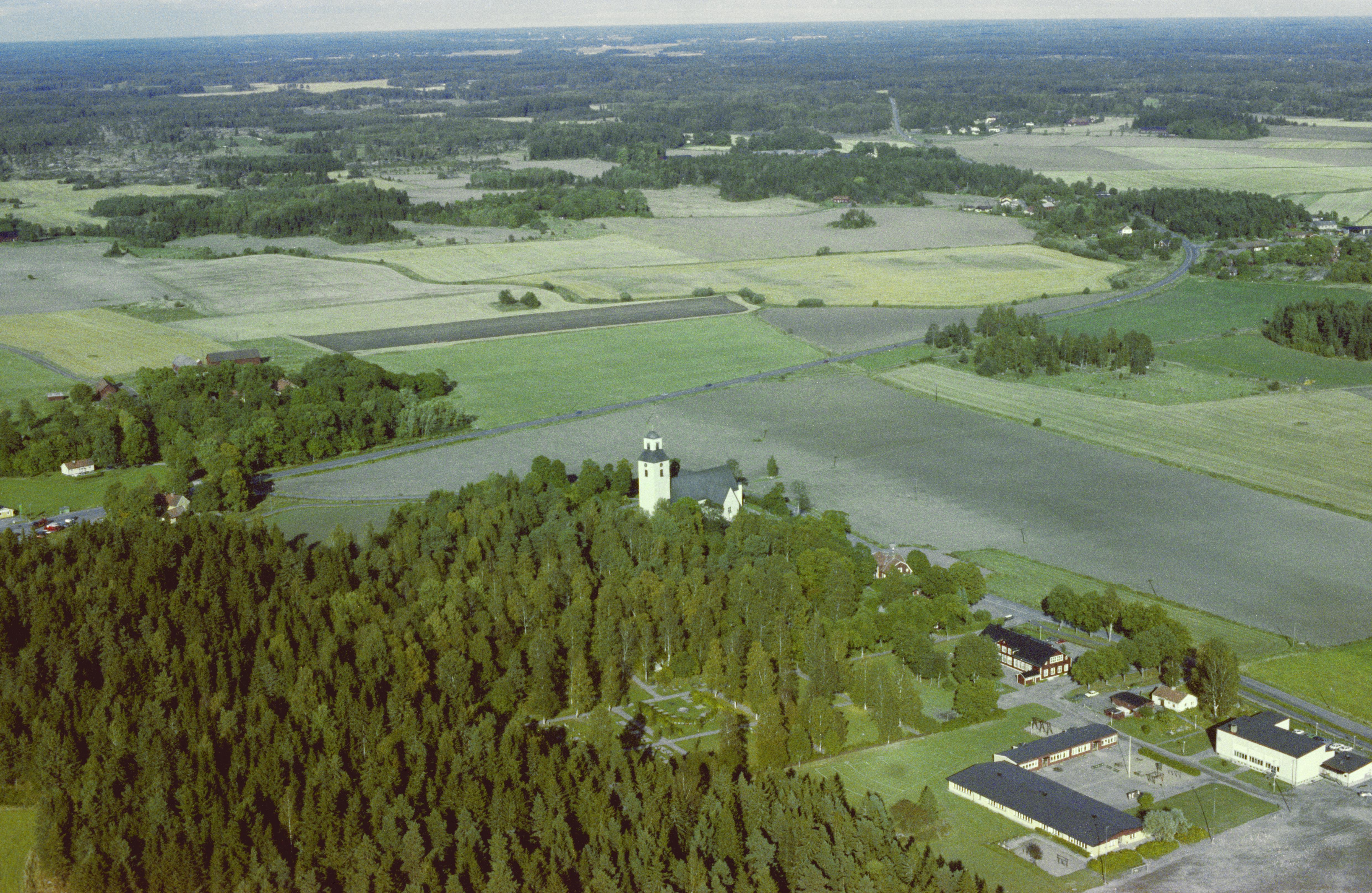 Beskrivning: Rasbo kyrka och kyrkby. Bilden är tagen mot (väderstreck): N