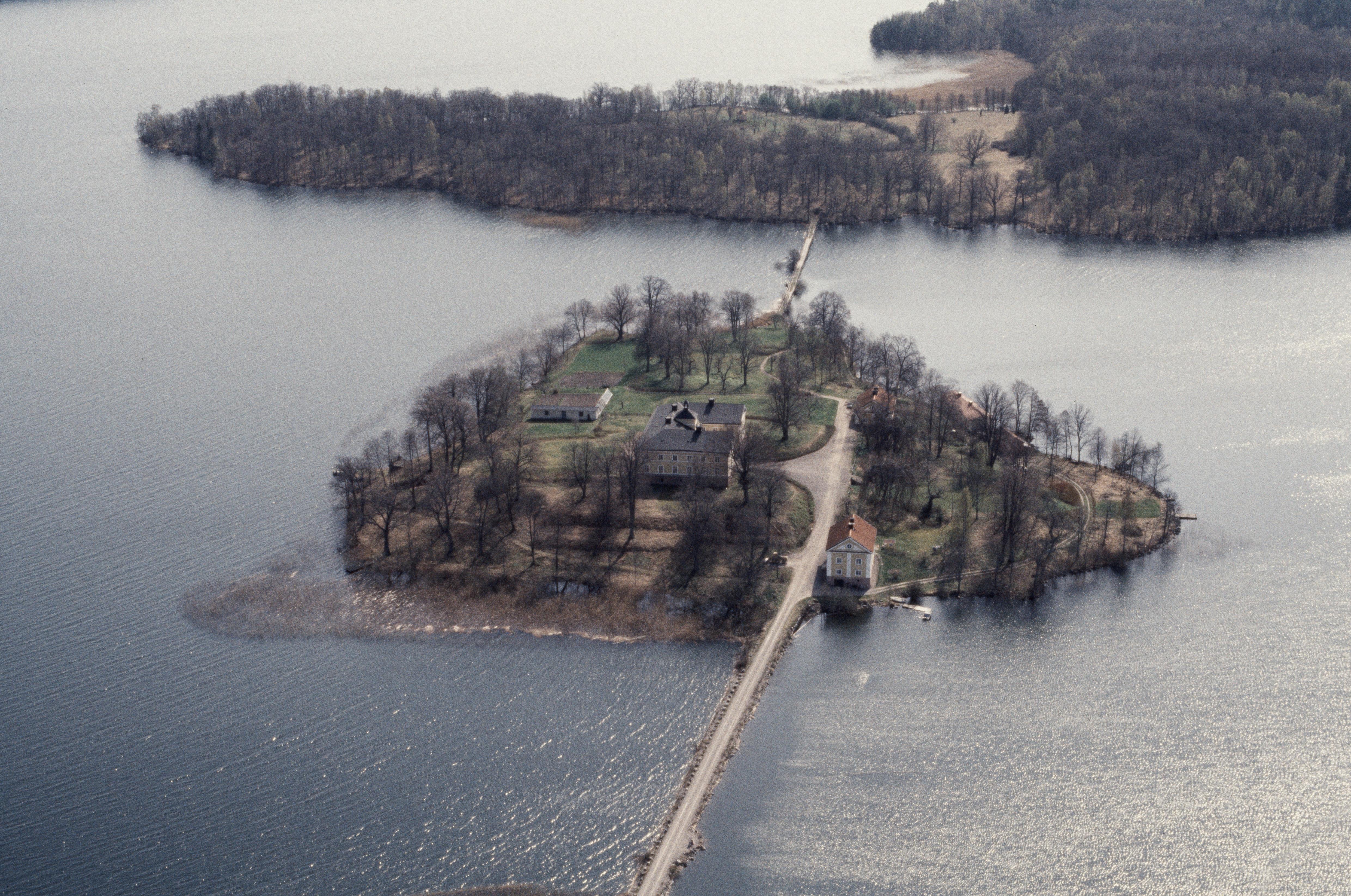 Beskrivning: Vibyholms slott RAÄnr Årdala 123:1 vid sjön Båven. Uppe till höger Djurön. Bilden är tagen mot (väderstreck): OSO