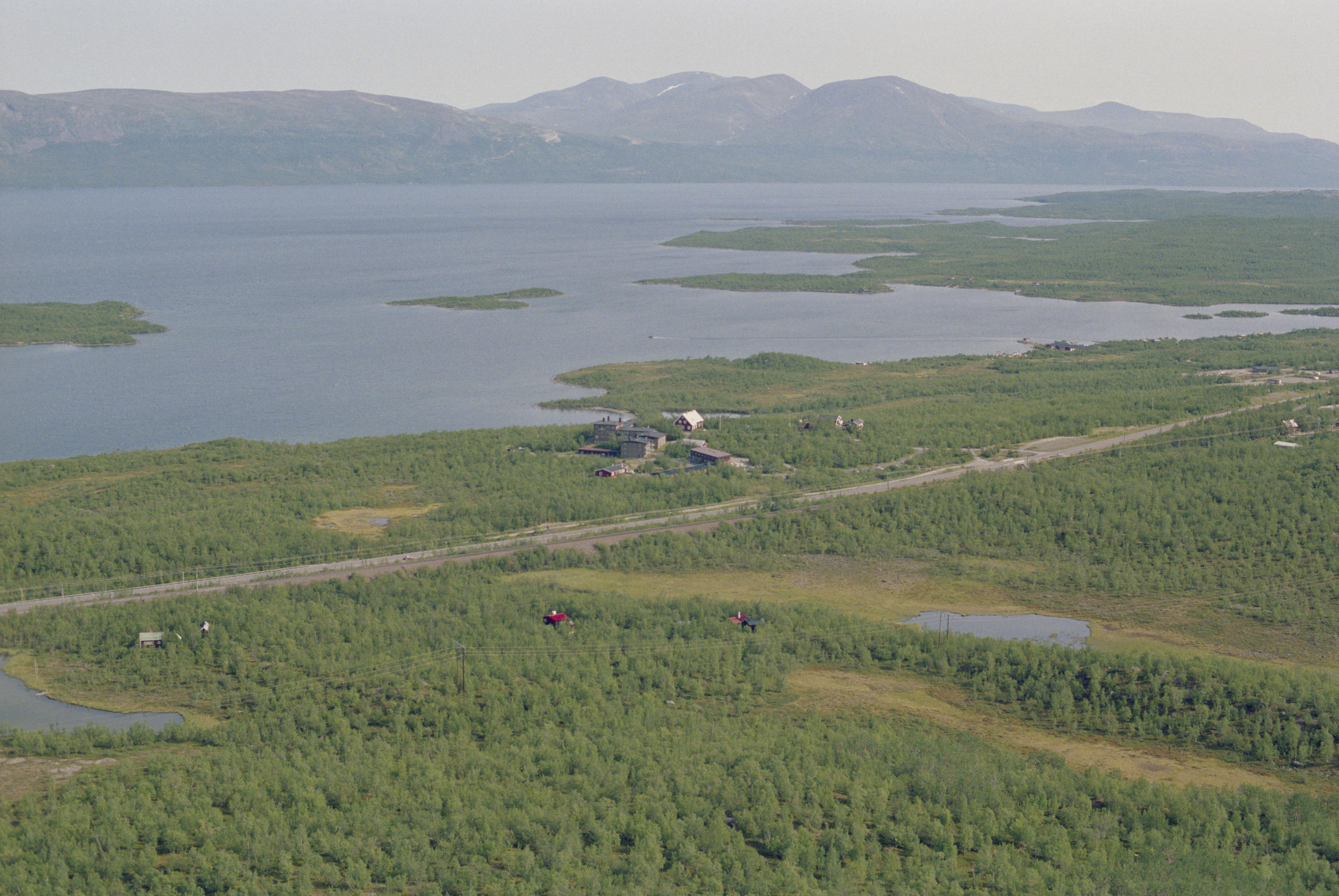 Beskrivning: Vid bildens mitt Forskningsstationen i orten Abisko (Ábeskovvu) vid sjön Torneträsk (Duortnosjávri). Vid stranden i bildens vänstra kant härd RAÄnr Jukkasjärvi 481:1 m.m. I bildens nedre del väg E10 och järnvägen Ofotbanen (Ofotbanan / Malmbanan). Delar av området ingår i Abisko nationalpark. Bilden är tagen mot (väderstreck): NO