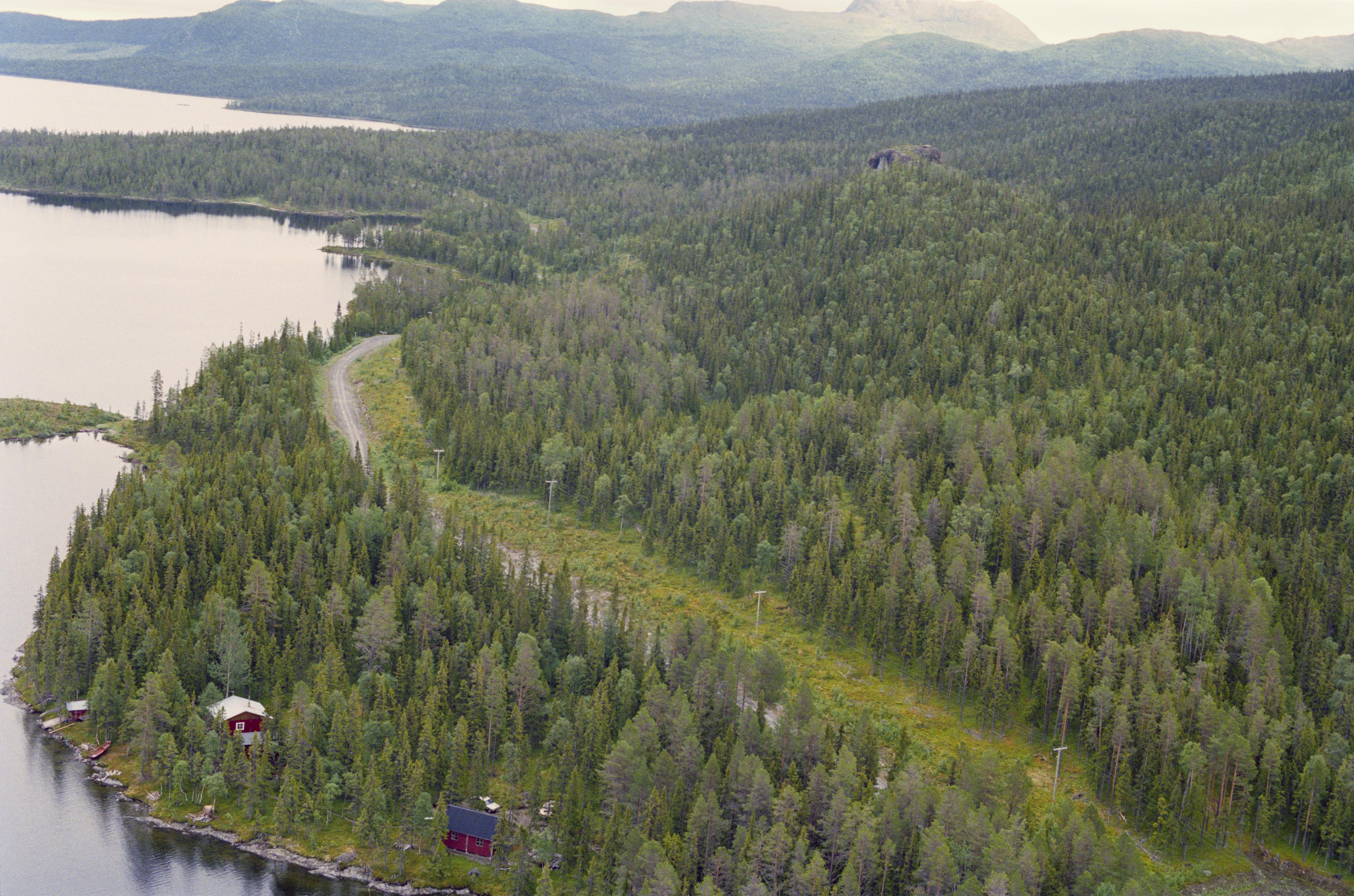 Beskrivning: Nere till vänster fritidshus vid Rönnbäckssjöns södra strand, väster i sjön Lill-Björkvattnet (Bearkede). Till höger bergsområdena Geavmoeasie och Vinberget. Bilden är tagen mot (väderstreck): Ö
