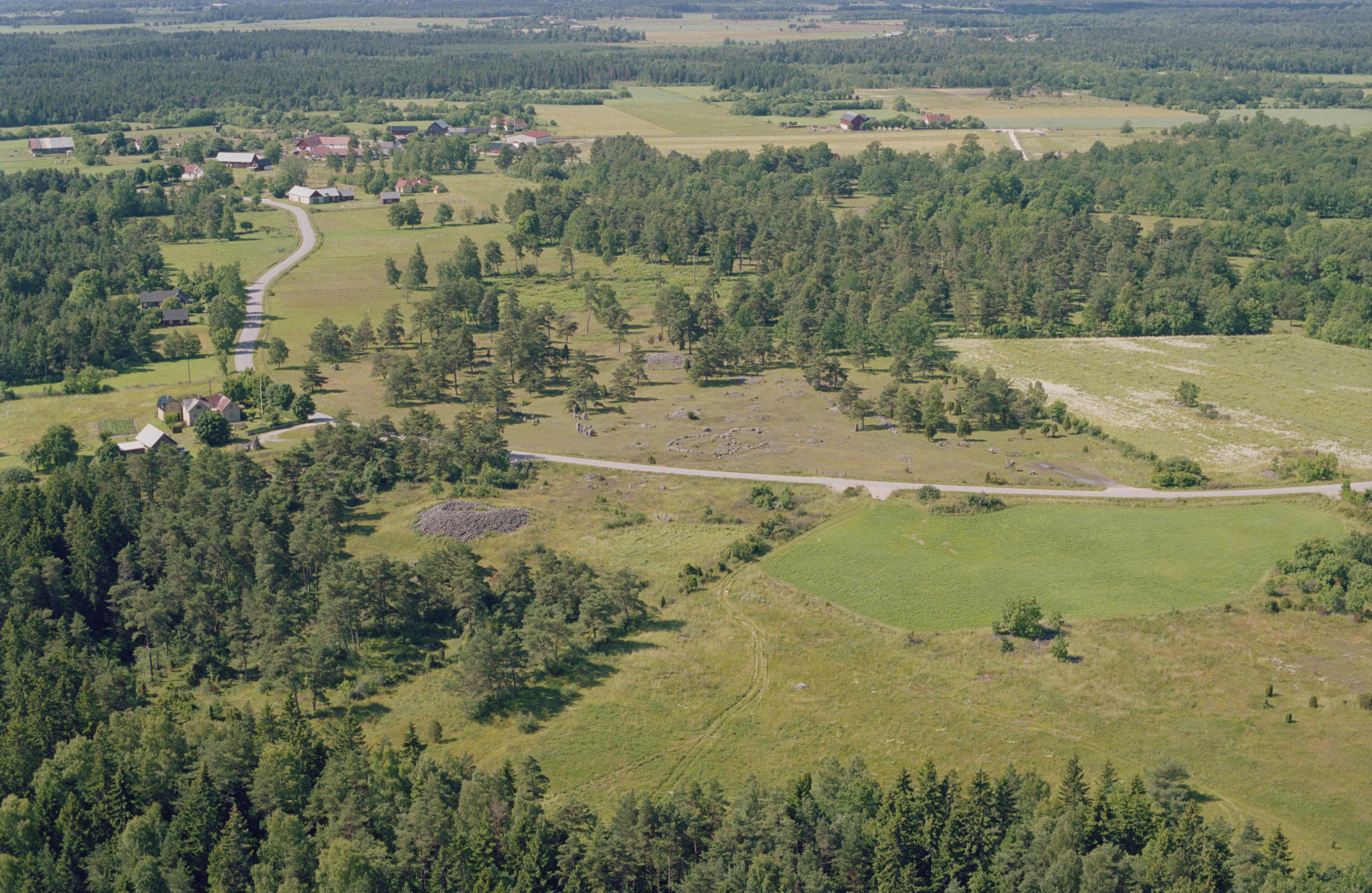 Beskrivning: På båda sidor av vägen Gålrums gravfält Alskog 9:1 med flera rösen och skeppssättningar m.m. Röset Digerrojr till vänster under bildens mitt. Byarna Guffride och Hallgårds uppe till vänster. Bilden är tagen mot (väderstreck): SV