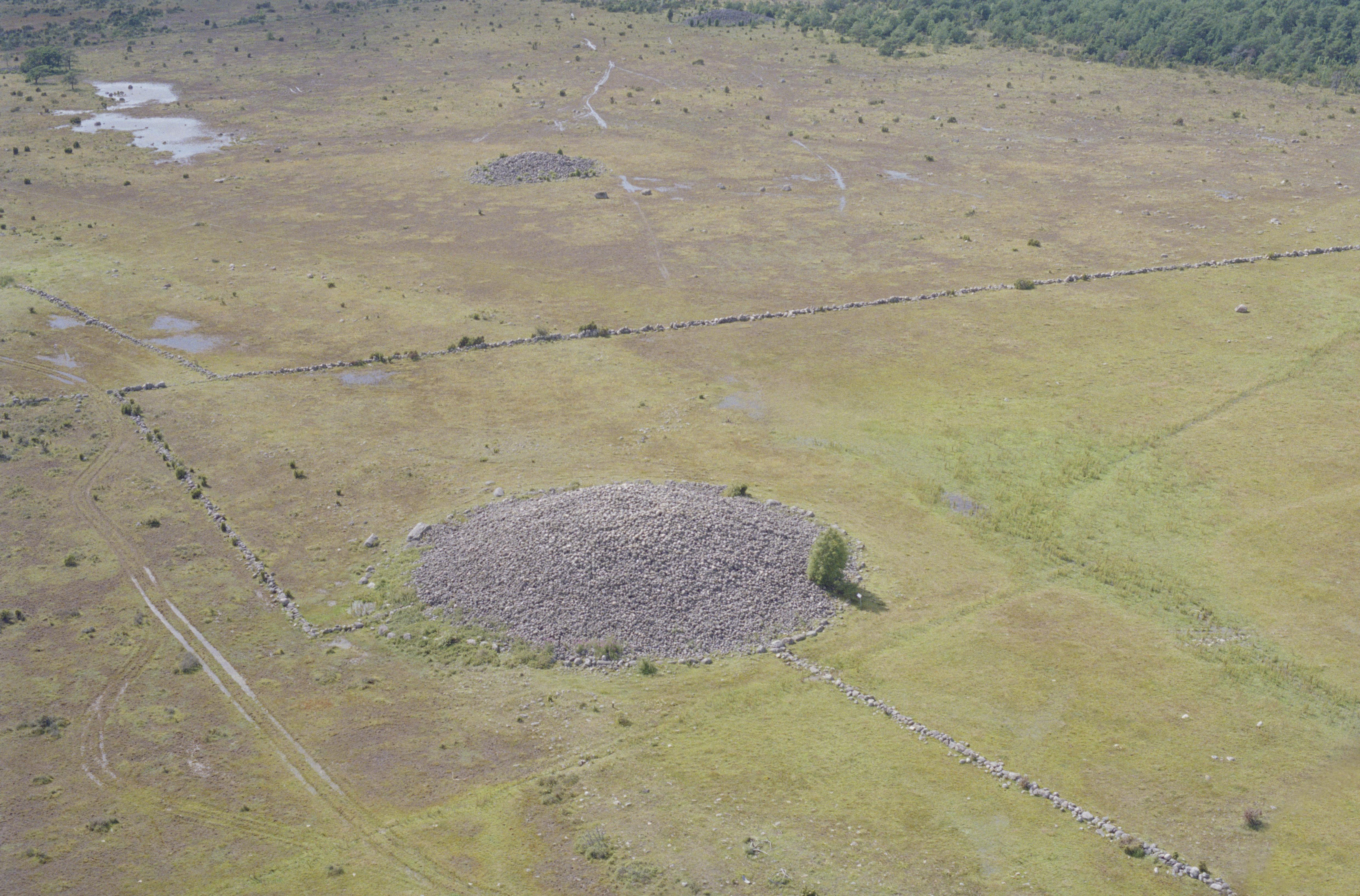 Beskrivning: Söder om Uggårde gård. Gravröset RAÄnr Rone 10:1 Uggarde rojr (skrivs även: Uggarde råir / Uggarderojr / Uggarderåjr m.m.). Bilden är tagen mot (väderstreck): V