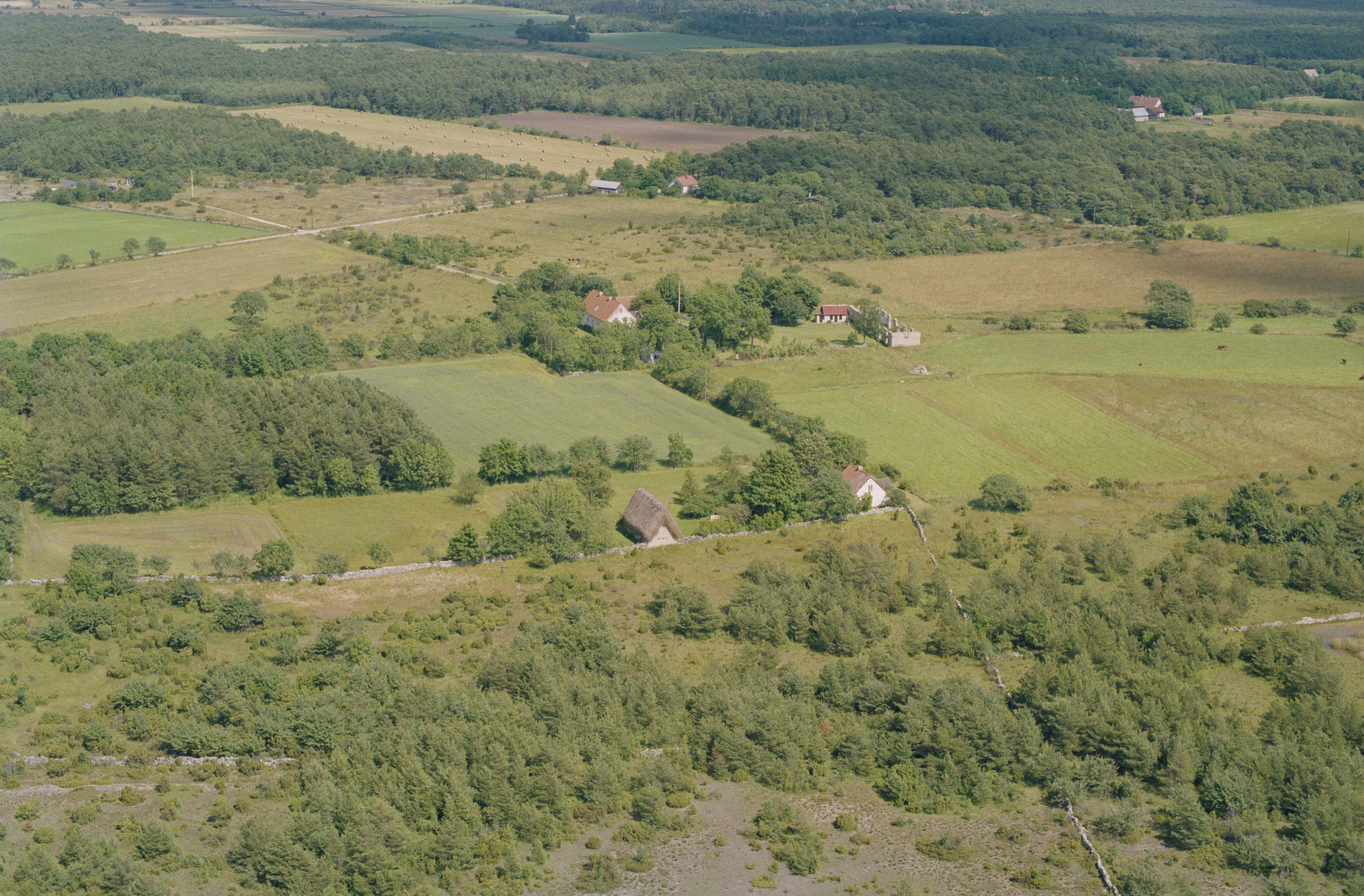 Beskrivning: Området Sippmanne i Gervalds by. Över bildens mitt Sippmanne medeltida husgrund (med delvis bevarade murar) RAÄnr Vamlingbo 63:1. Bilden är tagen mot (väderstreck): NO