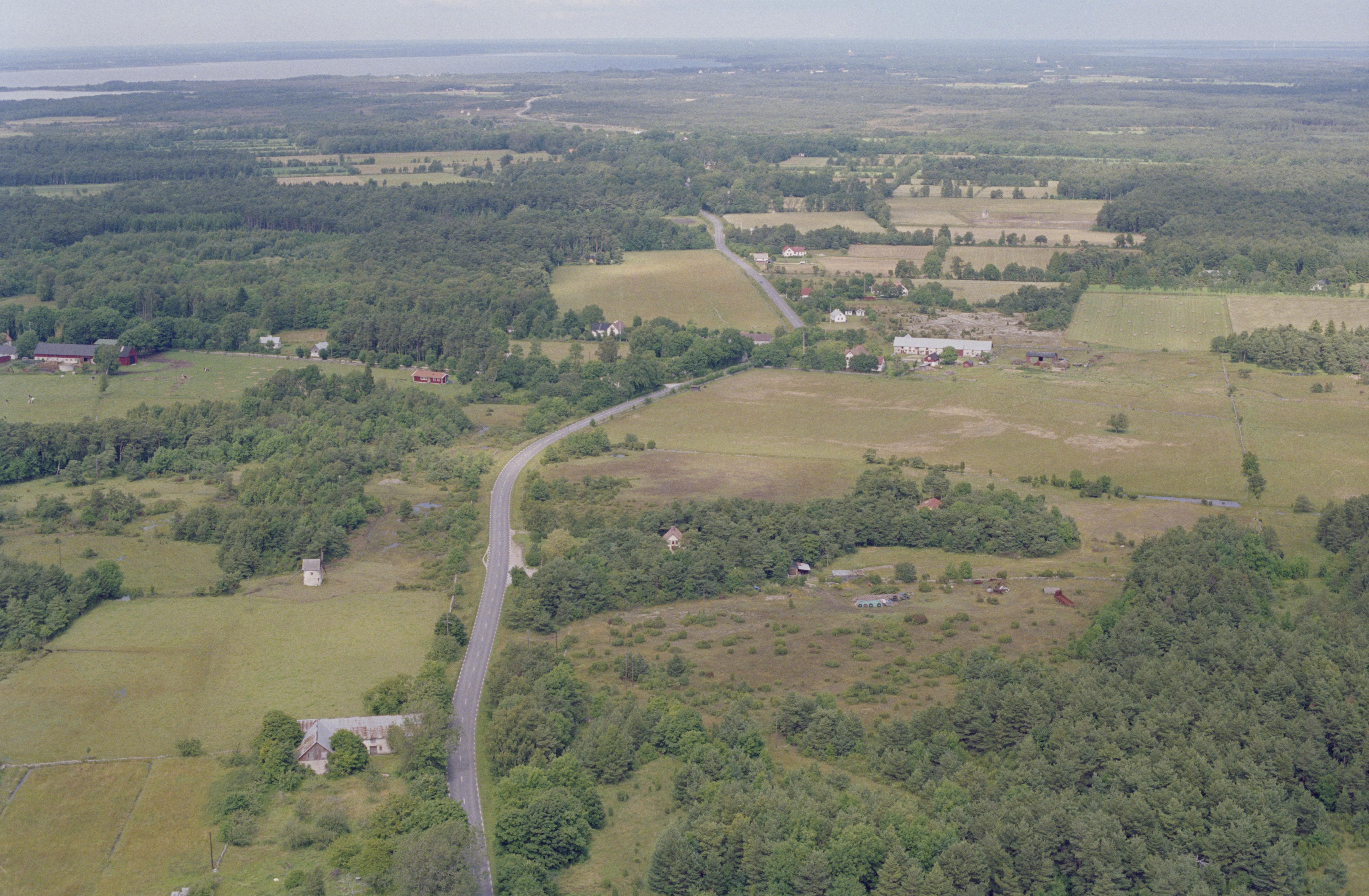 Beskrivning: Vid bildens mitt Storms by i området Norrbyn. I skogen uppe till vänster område med fossil åker RAÄnr Vamlingbo 134:1. I bildens övre kant Näsudden i Näs socken och till höger Öja socken. Bilden är tagen mot (väderstreck): NNO