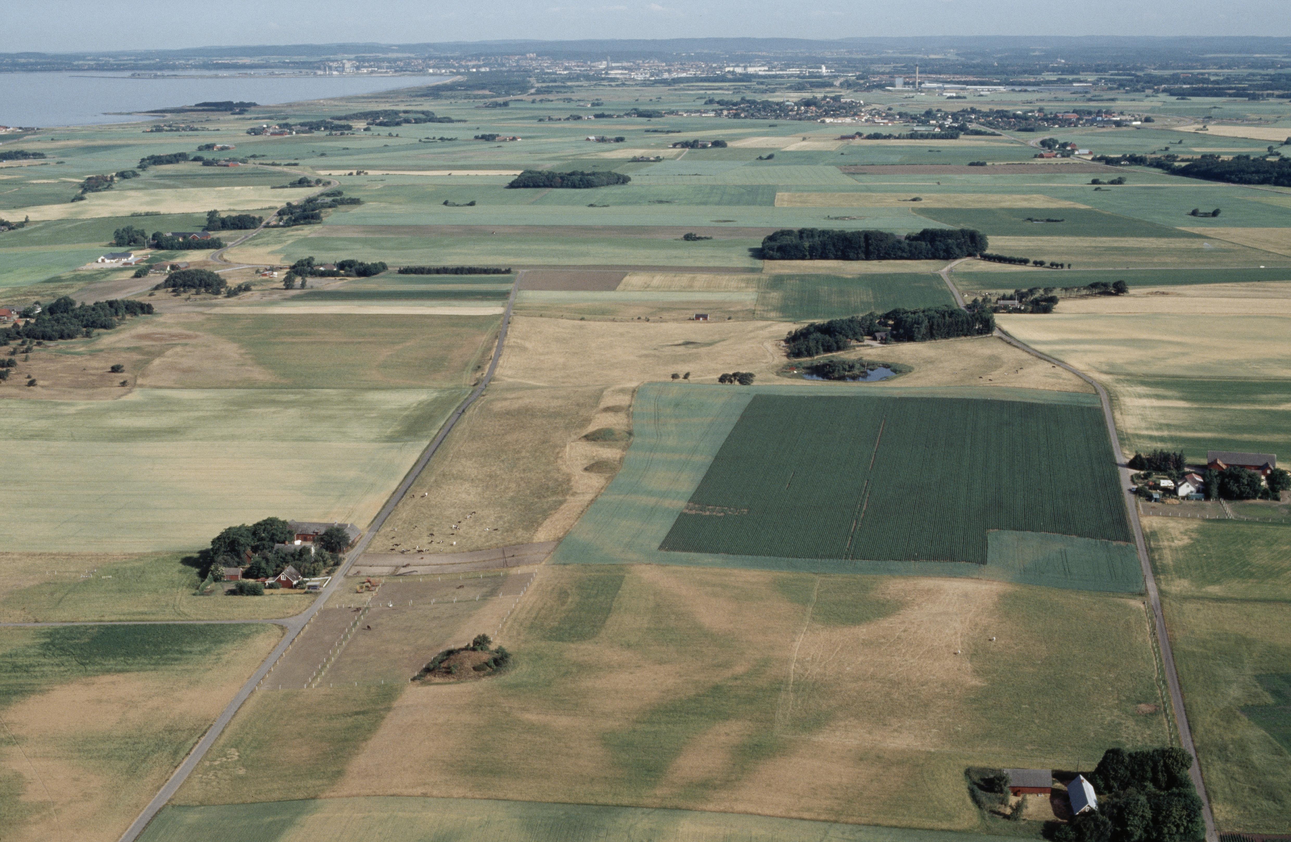 Beskrivning: Truedsgården. Gravhögar RAÄnr Eldsberga 2:1, 3:1, 4:1 m.fl. till vänster om bildens mitt. Bilden är tagen mot (väderstreck): NNV