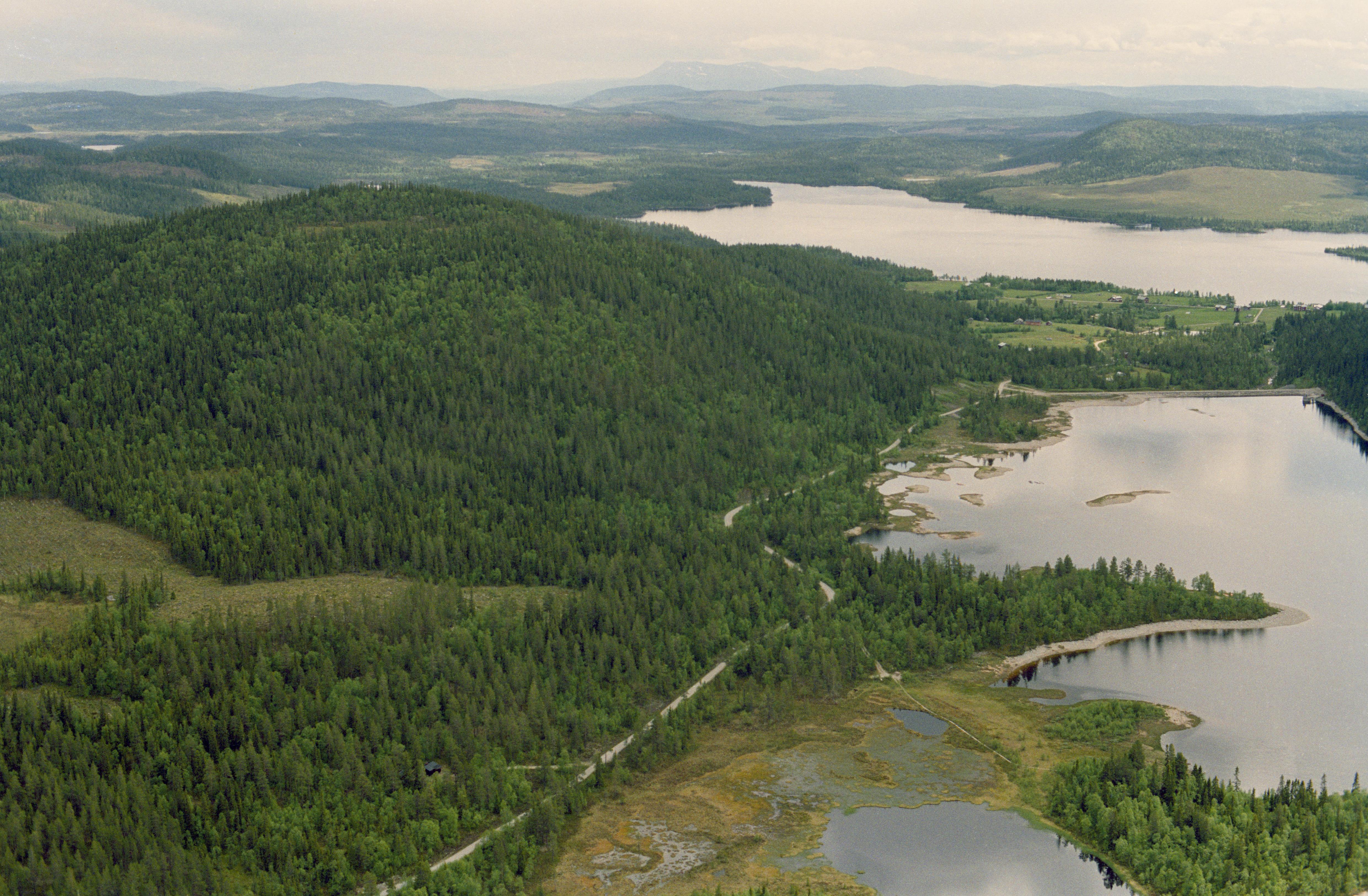 Beskrivning: Över-Särvsjön med härdar, boplatser m.m. på norra och östra sidan. Grannberget med hällmålning RAÄnr Hede 201:1 uppe till vänster. Under bildens mitt boplats RAÄnr Hede 258:1-4 m.fl. Uppe till höger Grannbergets by vid Neder-Särvsjön. Bilden är tagen mot (väderstreck): S