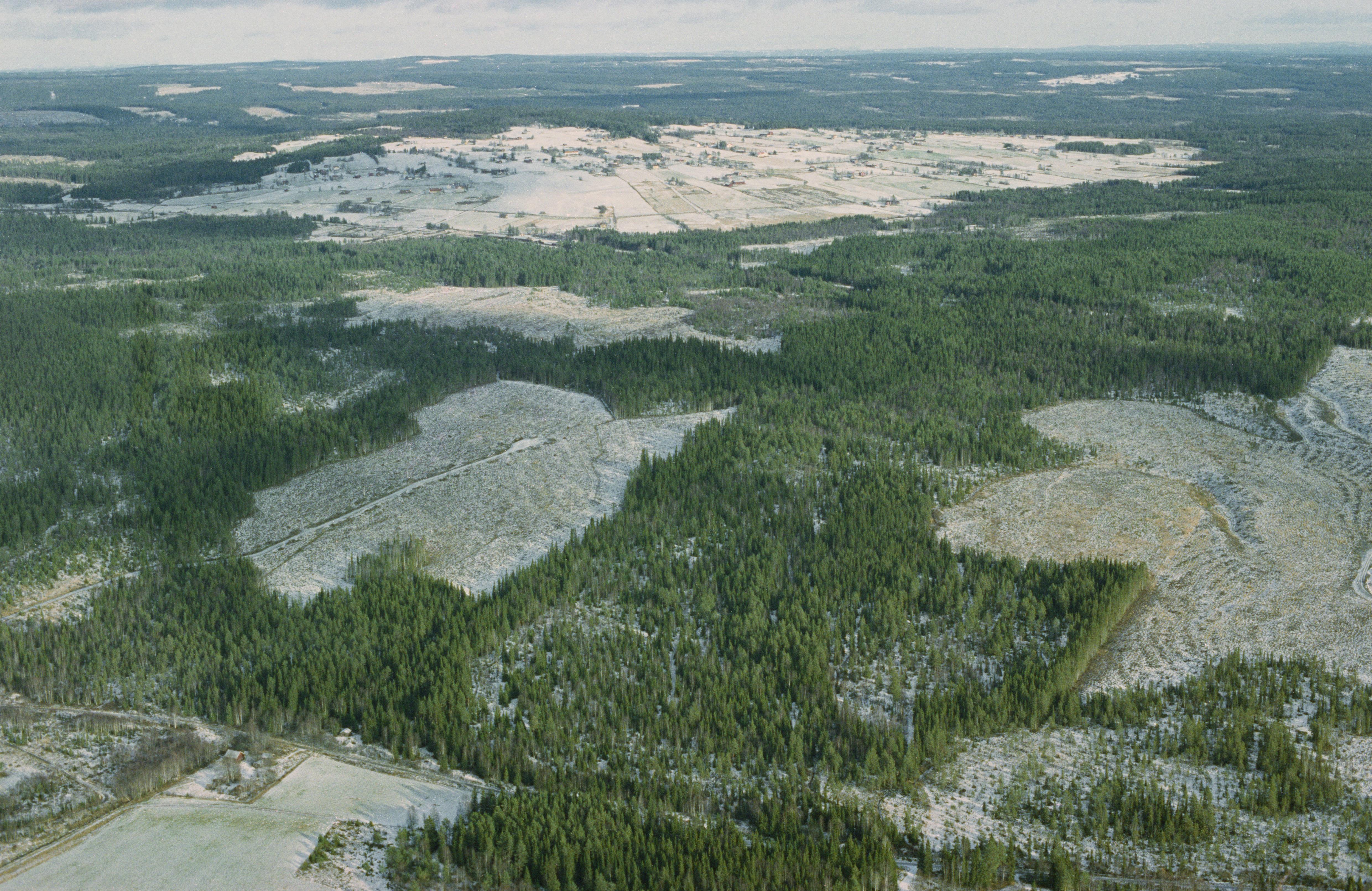 Beskrivning: Ån Hårkans dalgång. Torpet Hårkvallarna nere till vänster. Vid bildens mitt fångstgrop RAÄnr Häggenås 39:1 och 32:1-3 m.fl. Norderåsen by i bildens övre del. Bilden är tagen mot (väderstreck): VNV