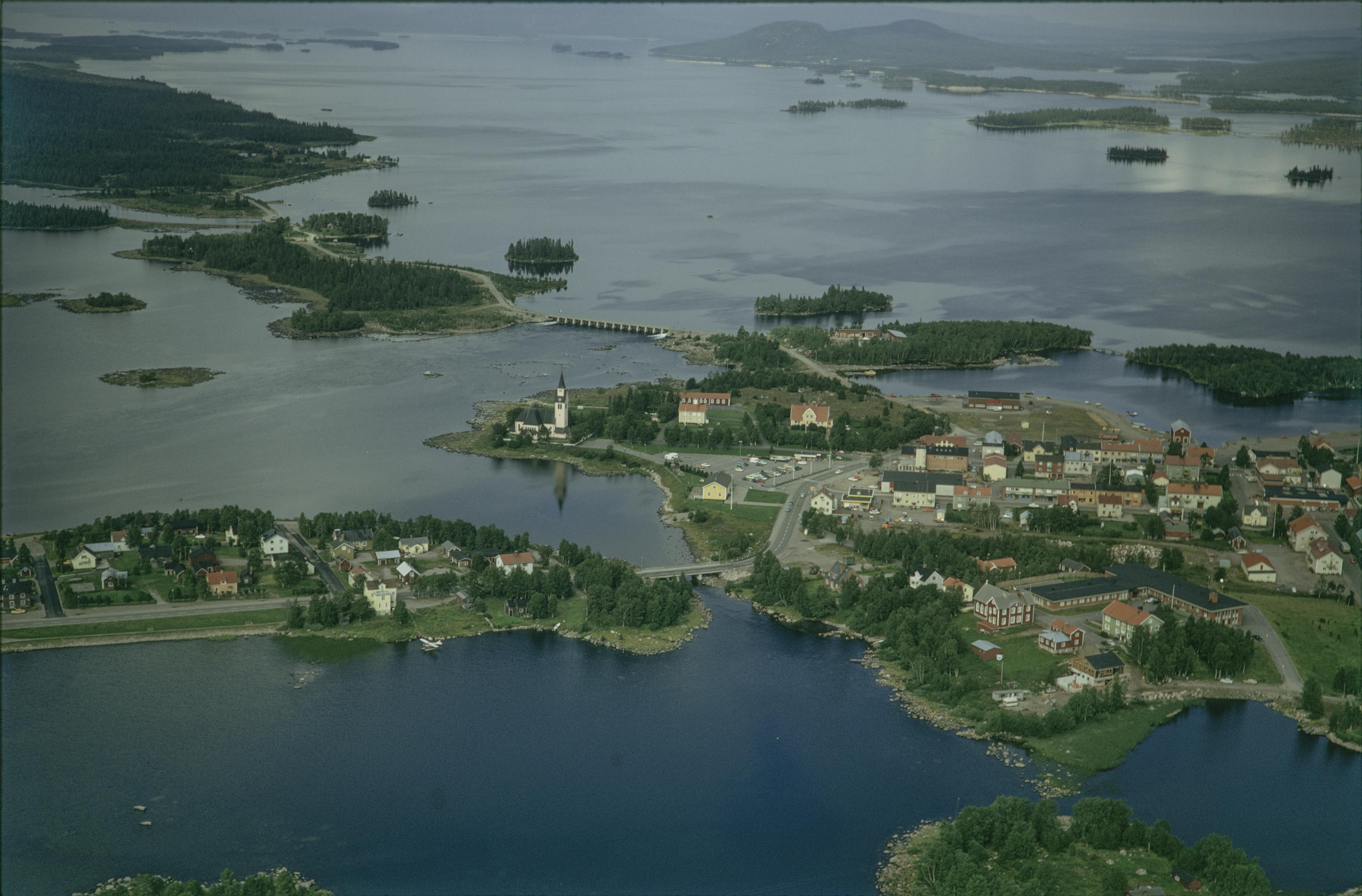 Beskrivning: Tätorten Arjeplog (Árjepluovve) mellan sjöarna Uddjaur (Uvvjáge) och Hornavan (Tjårvek). Arjeplogs kyrka vid bildens mitt. Vid kyrkan en kyrk- och marknadsplats RAÄnr Arjeplog 2691:1. Bilden är tagen mot (väderstreck): NNV