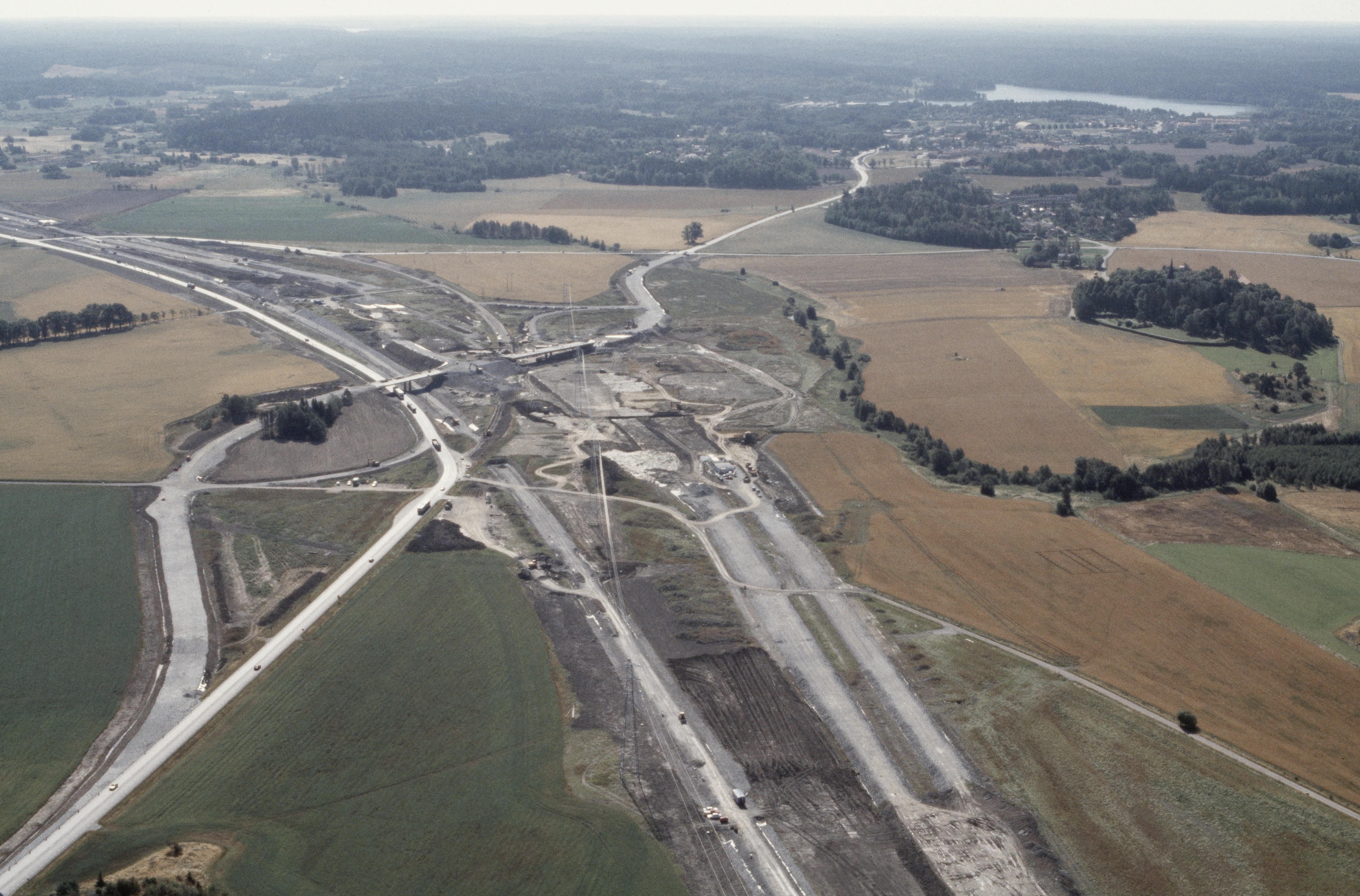 Beskrivning: Arkeologisk undersökning innan bygge av väg E20 norrost om Åkers kyrka och Löta å. Grav- och boplatser RAÄnr Åker 271:1-2, 268:1, 282:1, 283:1, m.fl. vid bildens mitt. Bilden är tagen mot (väderstreck): SO