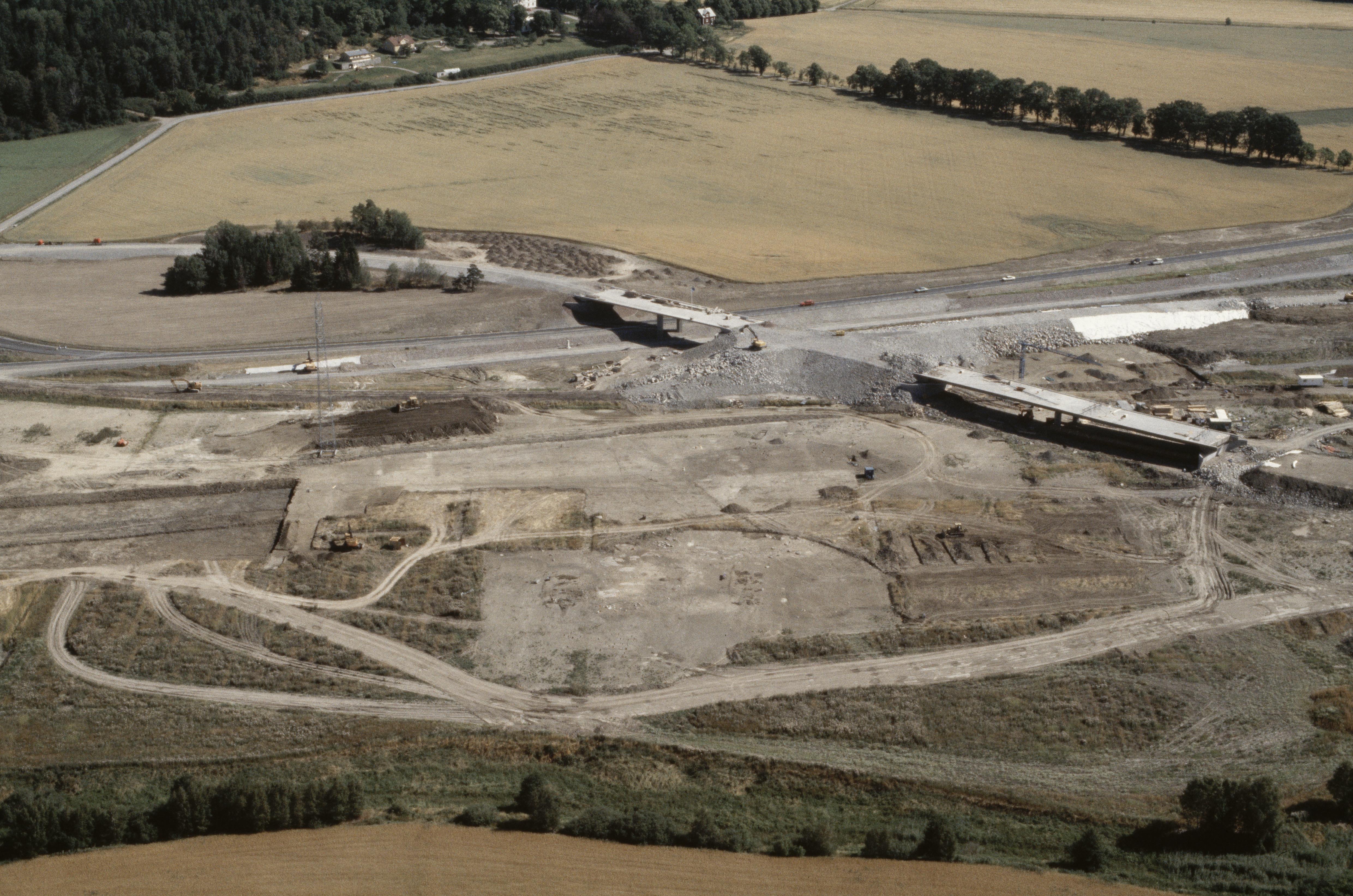 Beskrivning: Arkeologisk undersökning innan bygge av väg E20 norrost om Åkers kyrka och Löta å. Grav- och boplatser RAÄnr Åker 271:1-2, 268:1, 282:1, 283:1, m.fl. vid bildens mitt. Bilden är tagen mot (väderstreck): Ö