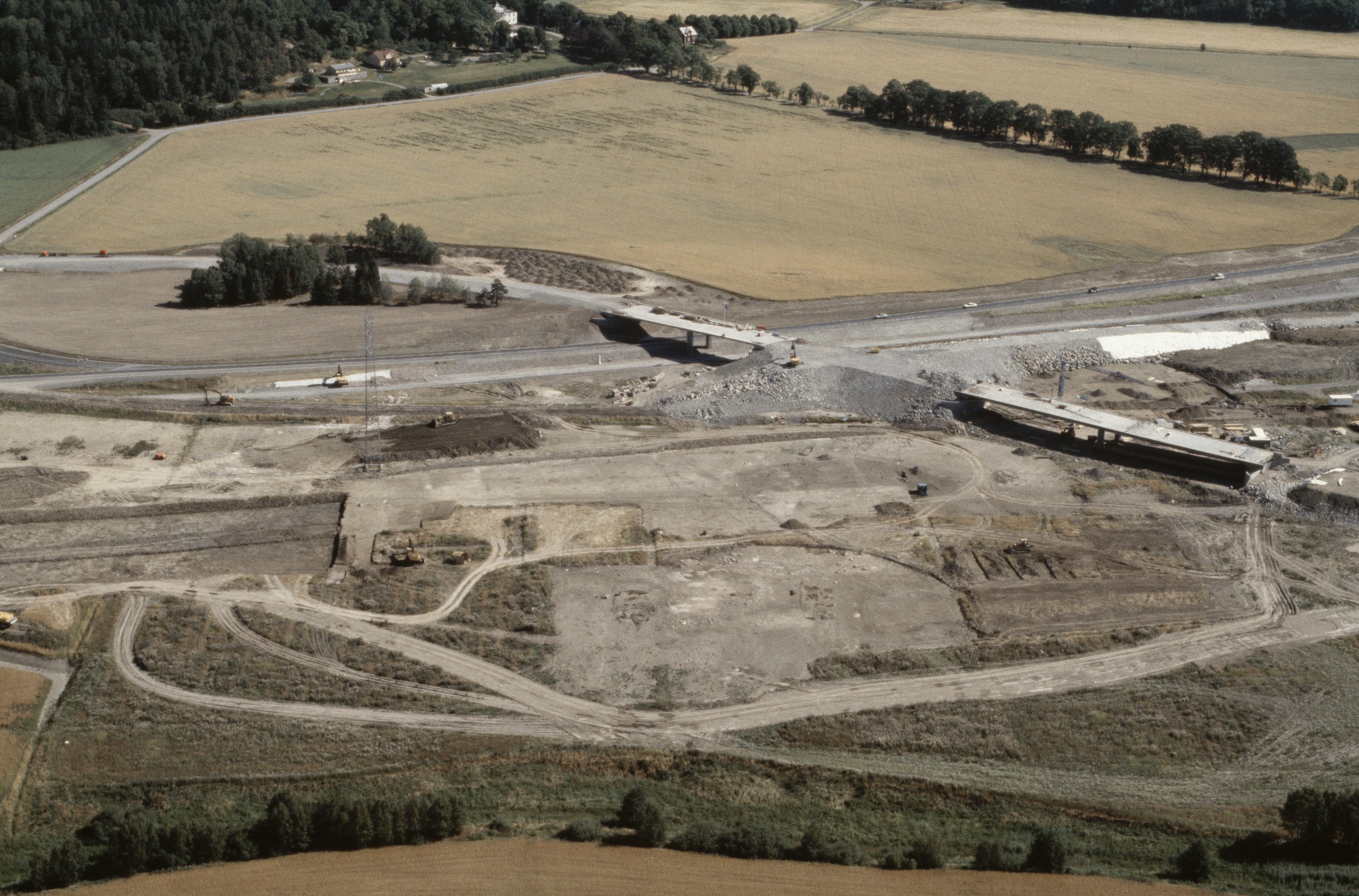 Beskrivning: Arkeologisk undersökning innan bygge av väg E20 norrost om Åkers kyrka och Löta å. Grav- och boplatser RAÄnr Åker 271:1-2, 268:1, 282:1, 283:1, m.fl. vid bildens mitt. Bilden är tagen mot (väderstreck): Ö