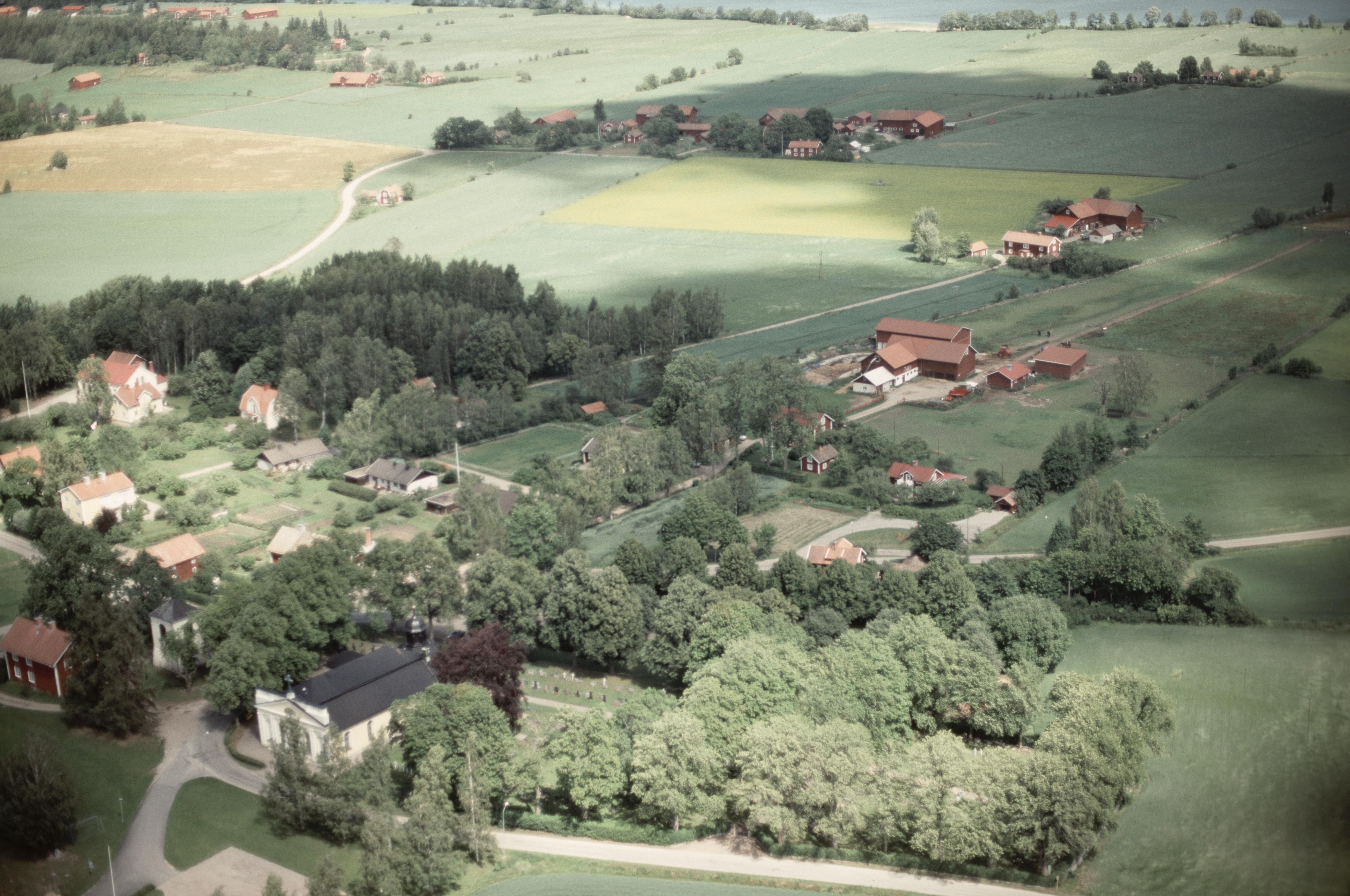 Beskrivning: Österåkers kyrka och kyrkby. Bilden är tagen mot (väderstreck): NO