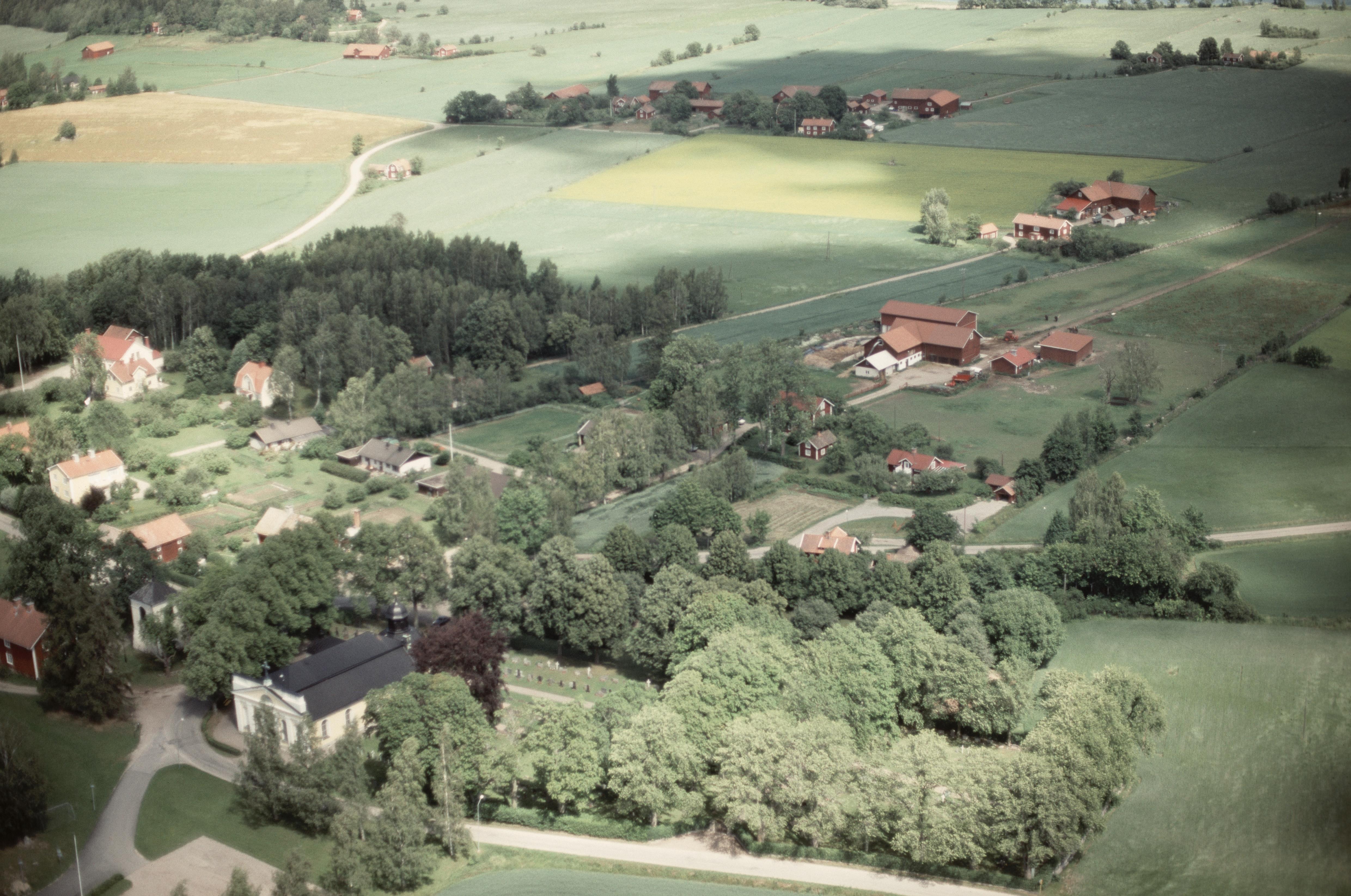 Beskrivning: Österåkers kyrka och kyrkby. Bilden är tagen mot (väderstreck): NO
