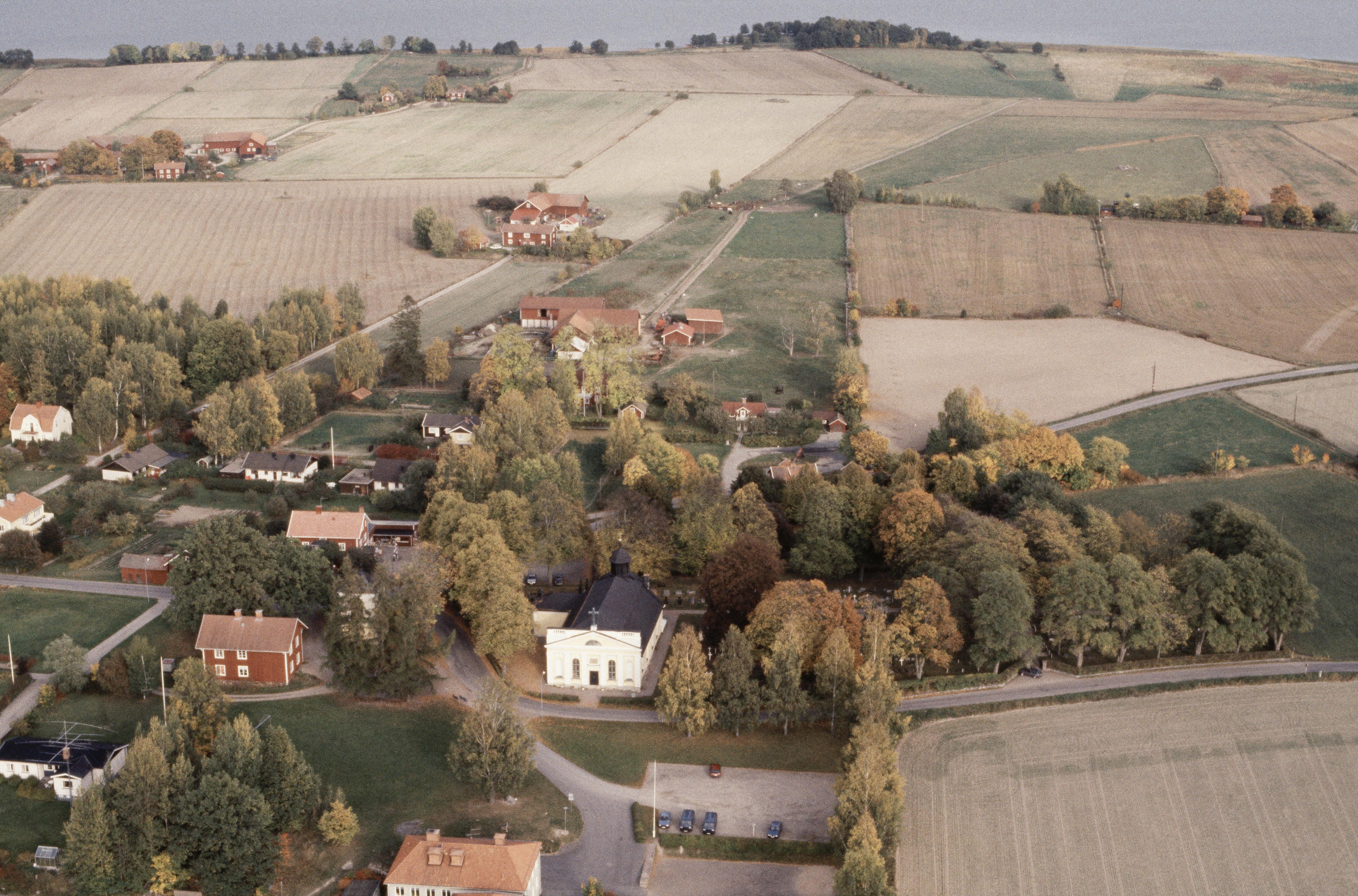 Beskrivning: Österåkers kyrka och kyrkby vid sjön Öljaren. Bilden är tagen mot (väderstreck): Ö