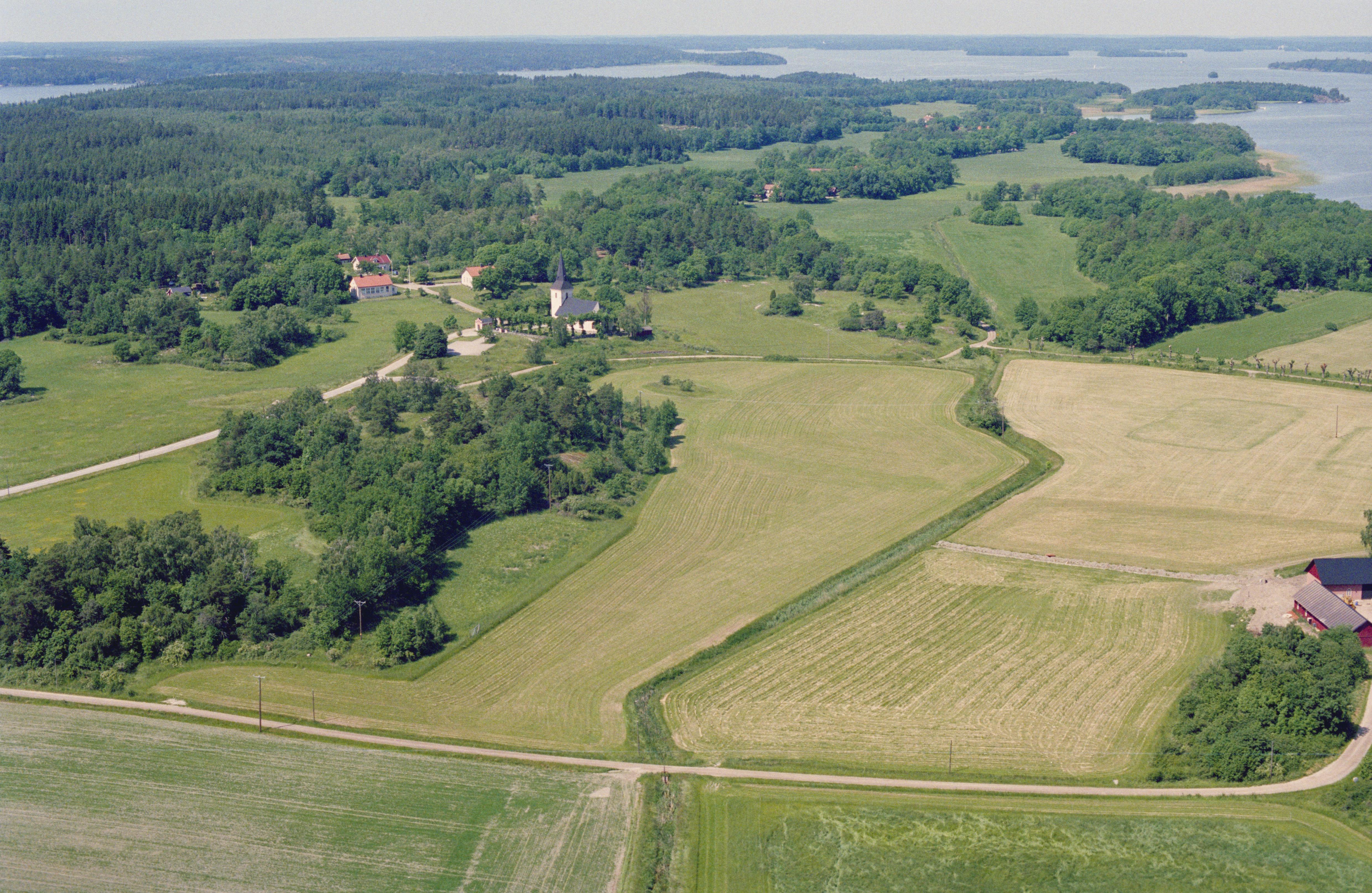 Beskrivning: Uppe till vänster Överenhörna hembygdsgård och Överenhörna kyrka. Över bildens mitt bytomt Husby backe RAÄnr Överenhörna 61:1-4. Uppe till höger Hornboviken i Mälaren. Bilden är tagen mot (väderstreck): VNV
