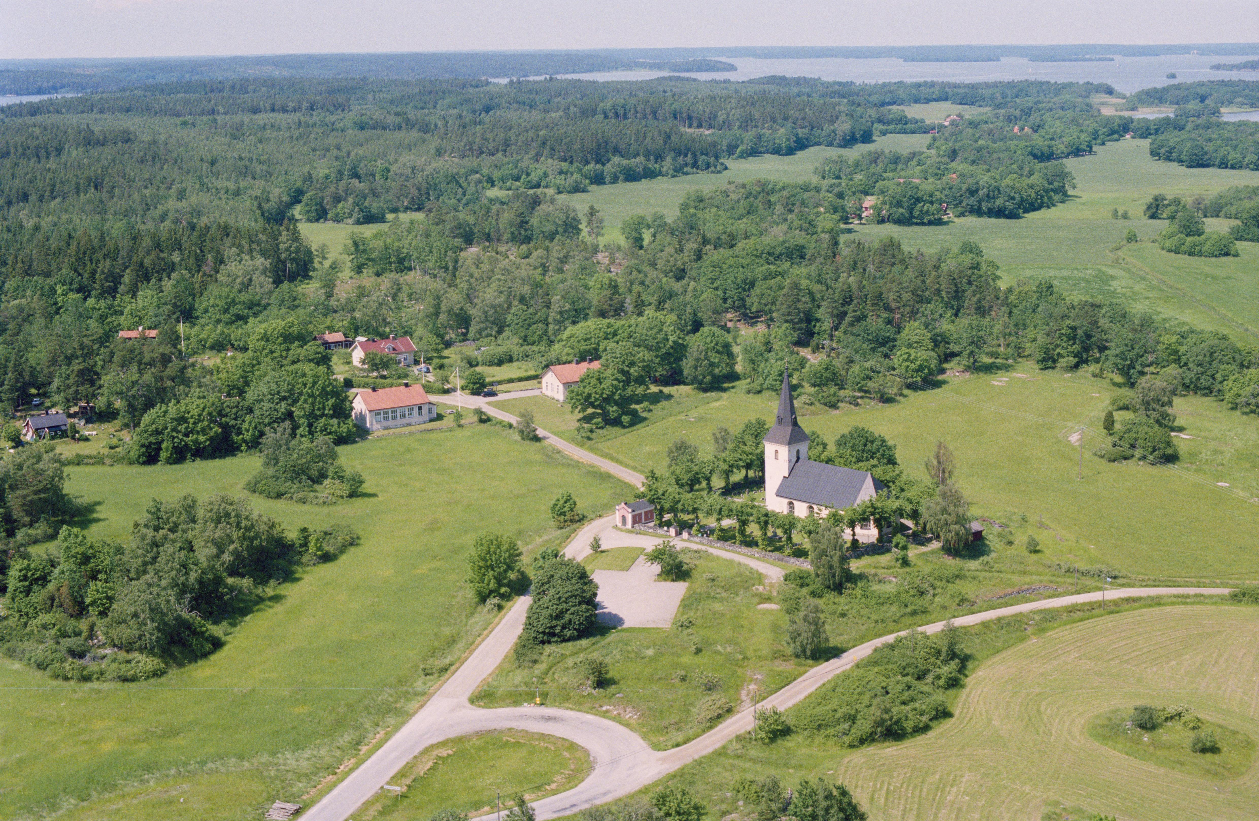 Beskrivning: Överenhörna kyrka och hembygdsgård. Till höger över bildens mitt bytomt Husby backe RAÄnr Överenhörna 61:1-4. I bildens övre del Hornboviken i Mälaren. Bilden är tagen mot (väderstreck): VNV