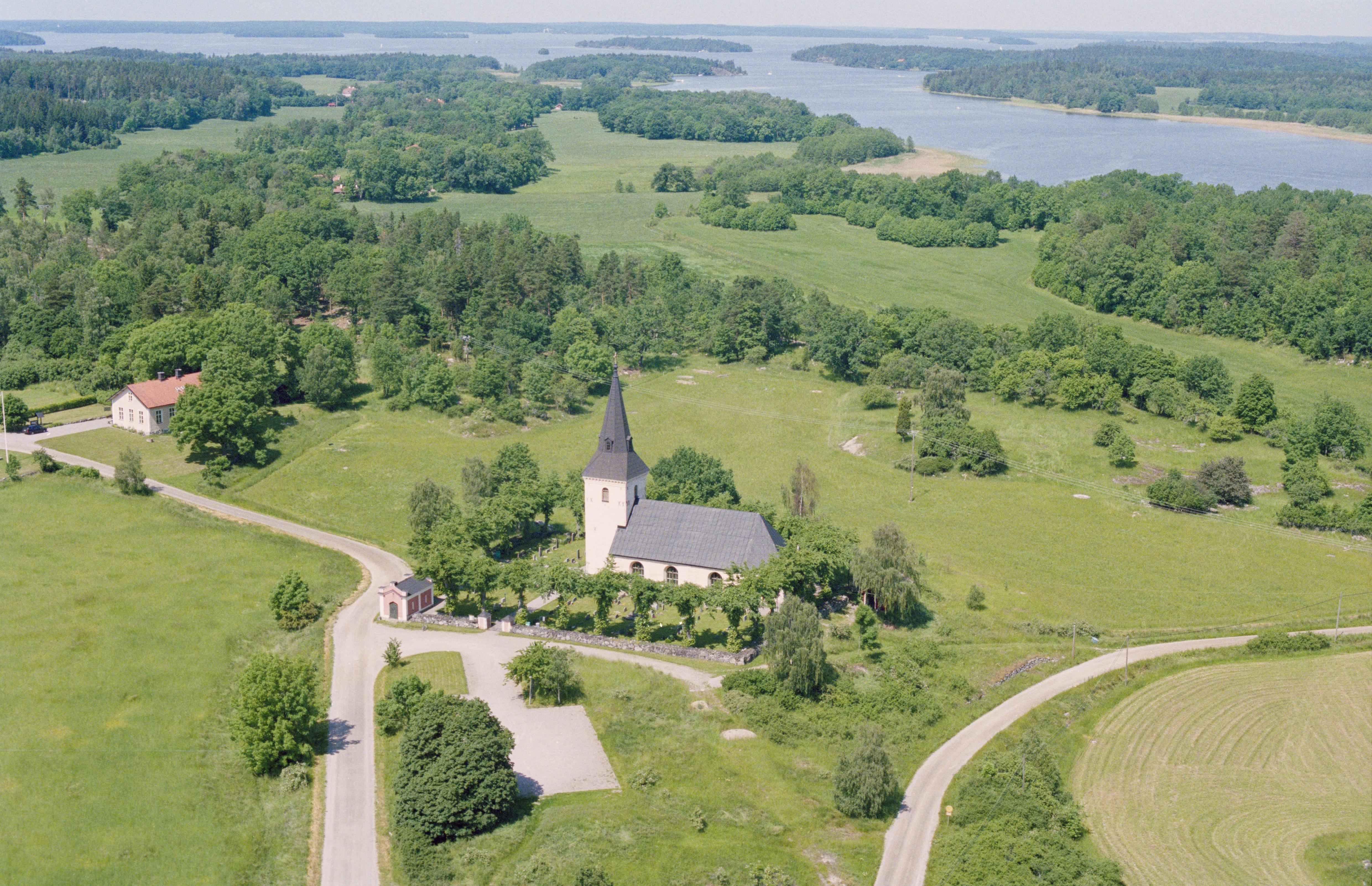 Beskrivning: Överenhörna kyrka och hembygdsgård. Till höger över bildens mitt bytomt Husby backe RAÄnr Överenhörna 61:1-4. I bildens övre del Hornboviken i Mälaren. Bilden är tagen mot (väderstreck): VNV