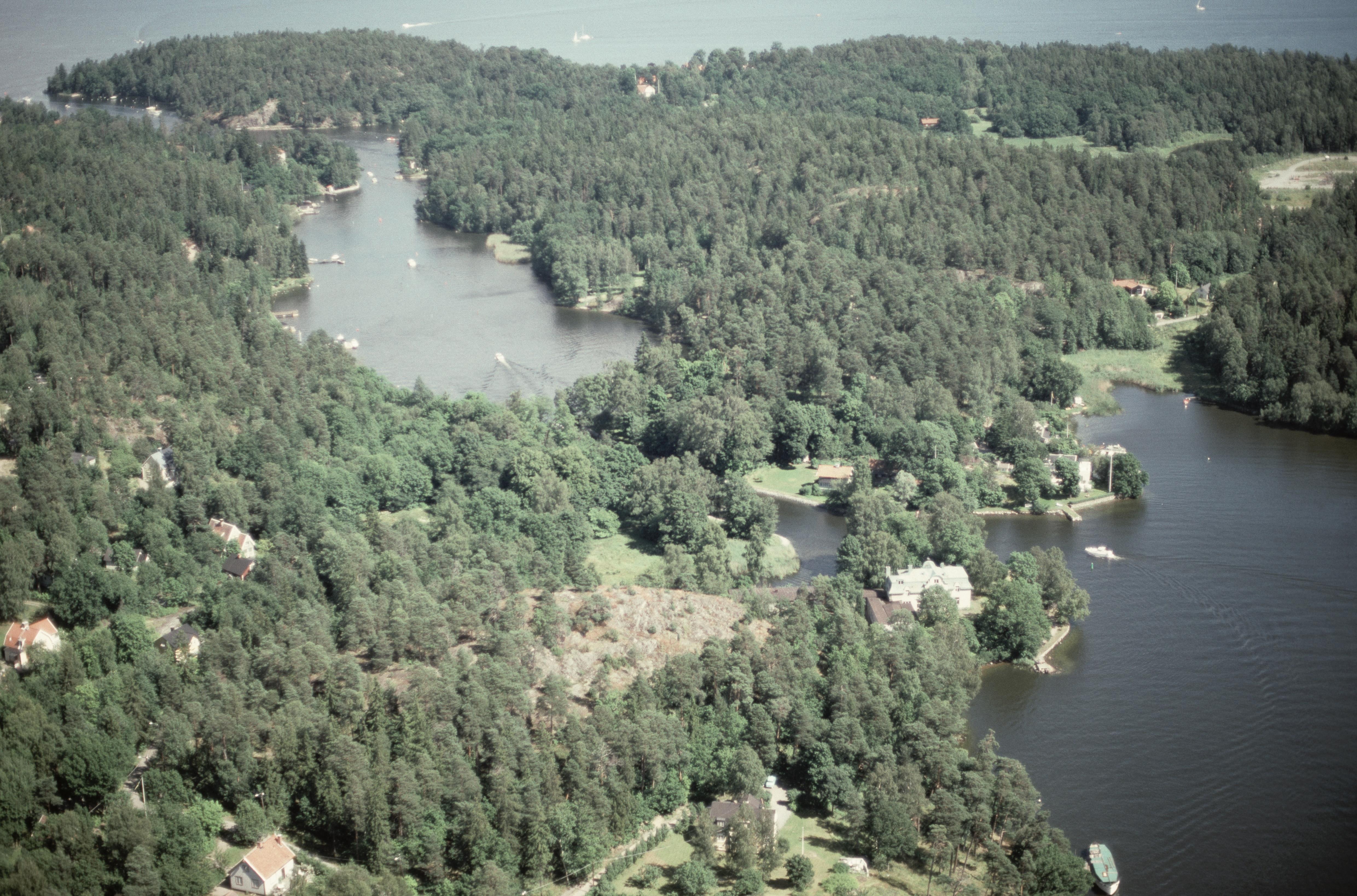 Beskrivning: Stäket och Fladen mellan Lännersta och Skogsö vid Lännerstasundet (i bildens nedre del). Skansar RAÄnr Boo 18:1 och RAÄnr Nacka 166:1 i bildens mitt. Bilden är tagen mot (väderstreck): ONO