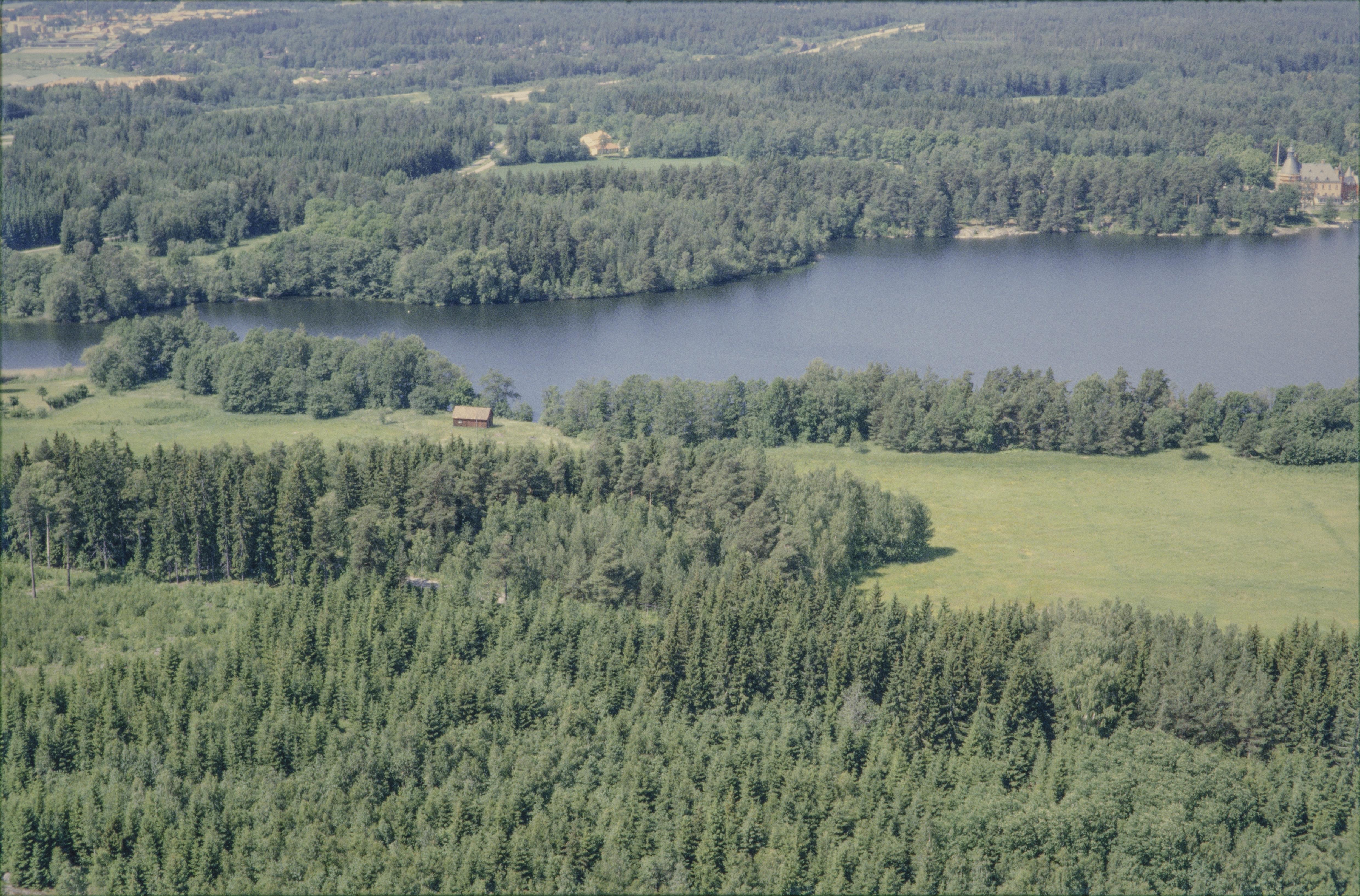 Beskrivning: Till vänster om bildens mitt torpet Stora Tingsviken vid södra änden av Lejondalssjön. Vid bildens mitt stensättning RAÄnr Bro 129:1. Lejondals slott uppe till höger. Bilden är tagen mot (väderstreck): V