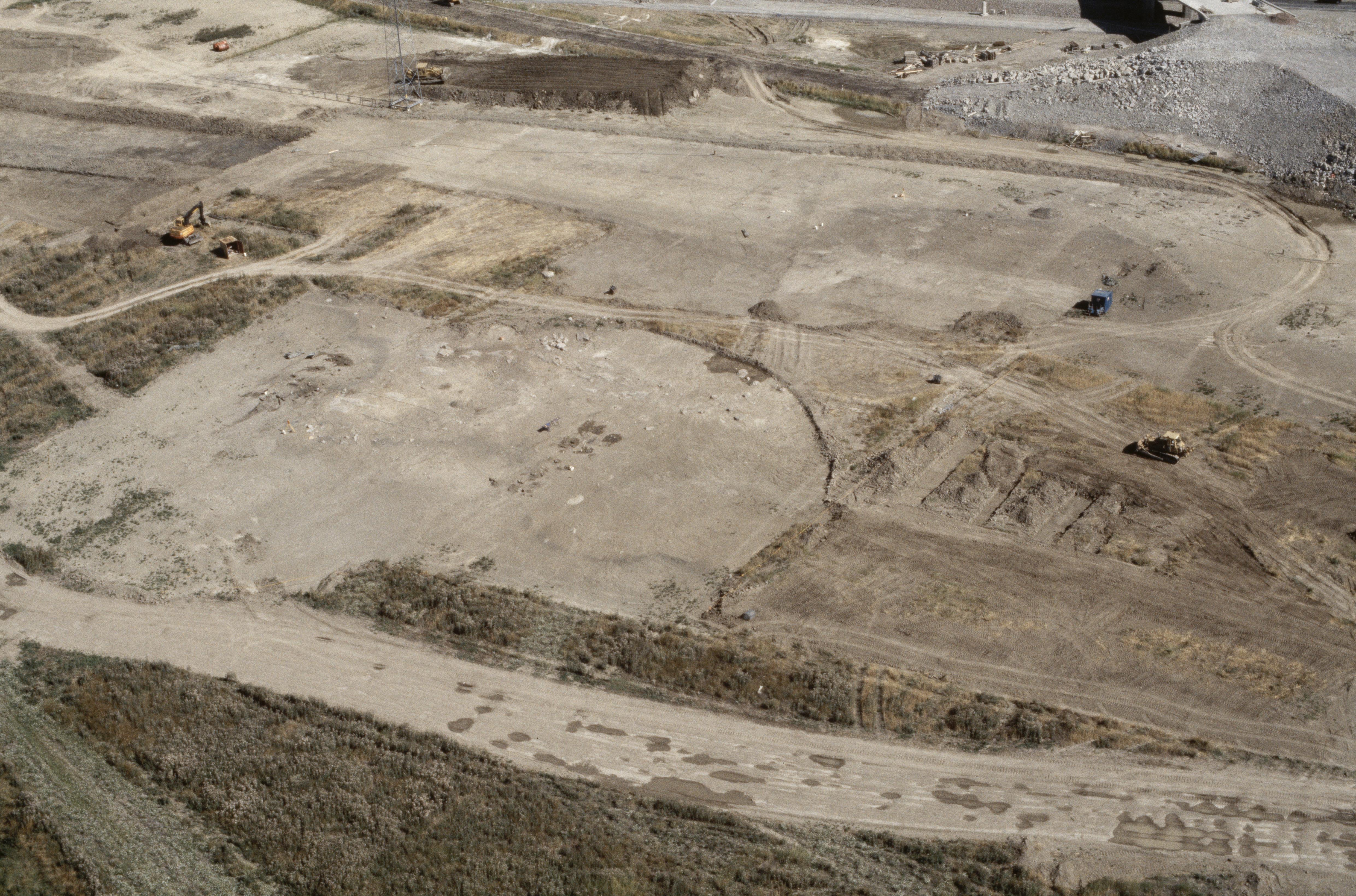 Beskrivning: Arkeologisk undersökning innan bygge av väg E20 norrost om Åkers kyrka och Löta å. Grav- och boplatser RAÄnr Åker 271:1-2, 268:1, 282:1, 283:1, m.fl. vid bildens mitt. Bilden är tagen mot (väderstreck): NO