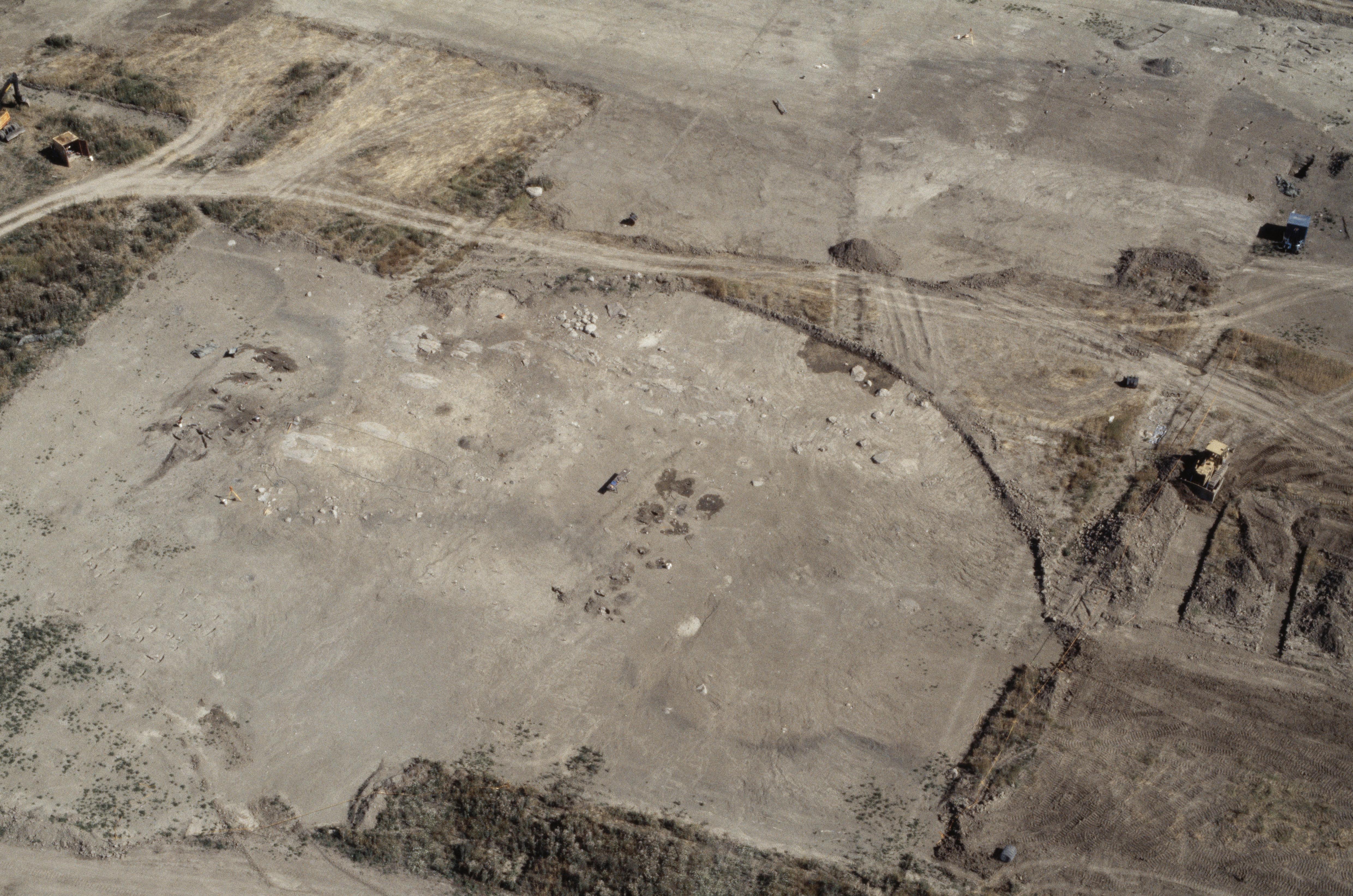 Beskrivning: Arkeologisk undersökning innan bygge av väg E20 norrost om Åkers kyrka och Löta å. Grav- och boplatser RAÄnr Åker 271:1-2, 268:1, 282:1, 283:1, m.fl. vid bildens mitt. Bilden är tagen mot (väderstreck): NO