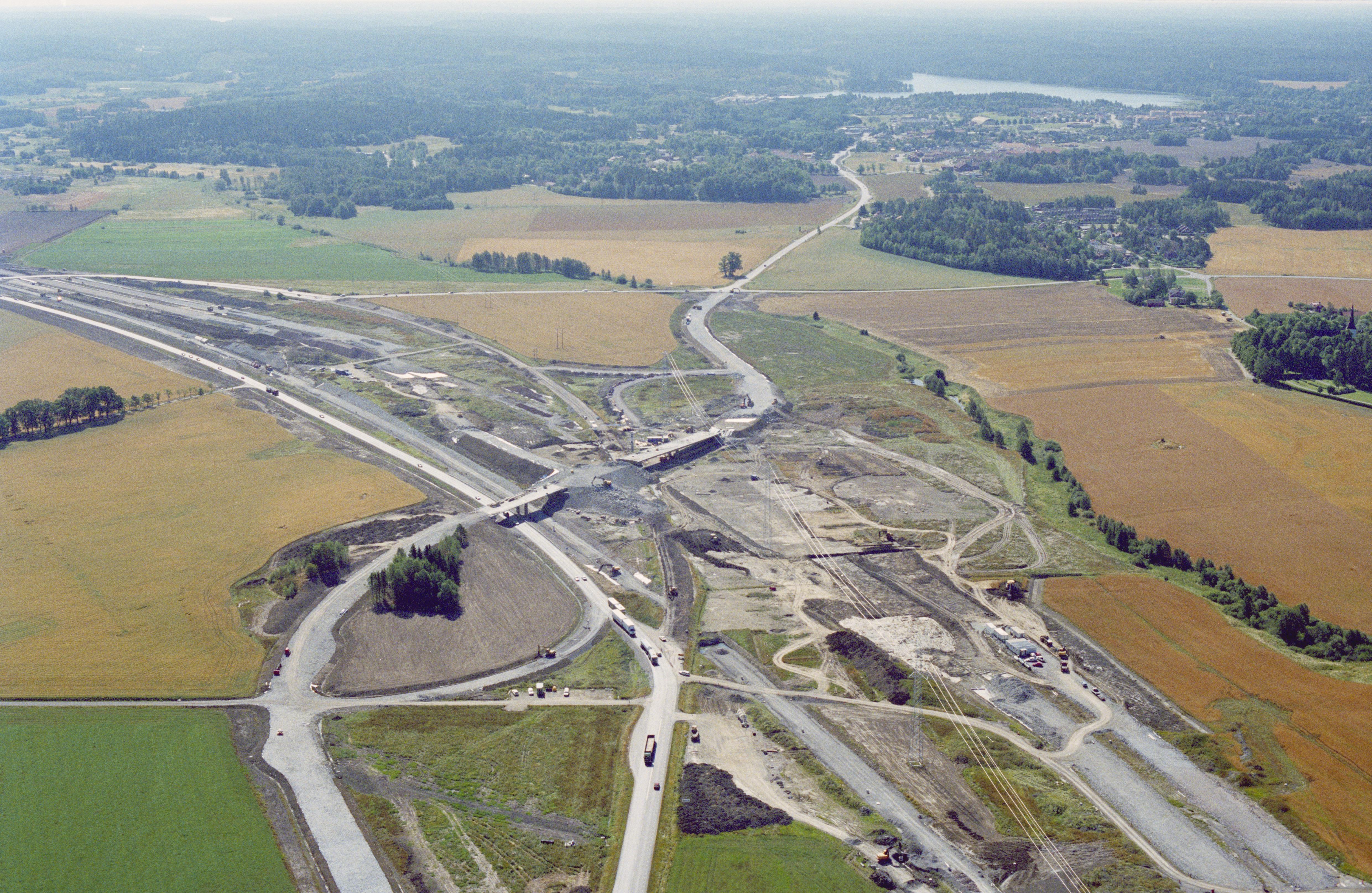 Beskrivning: Arkeologisk undersökning innan bygge av väg E20 norrost om Åkers kyrka och Löta å. Grav- och boplatser RAÄnr Åker 271:1-2, 268:1, 282:1, 283:1, m.fl. vid bildens mitt. Bilden är tagen mot (väderstreck): SO