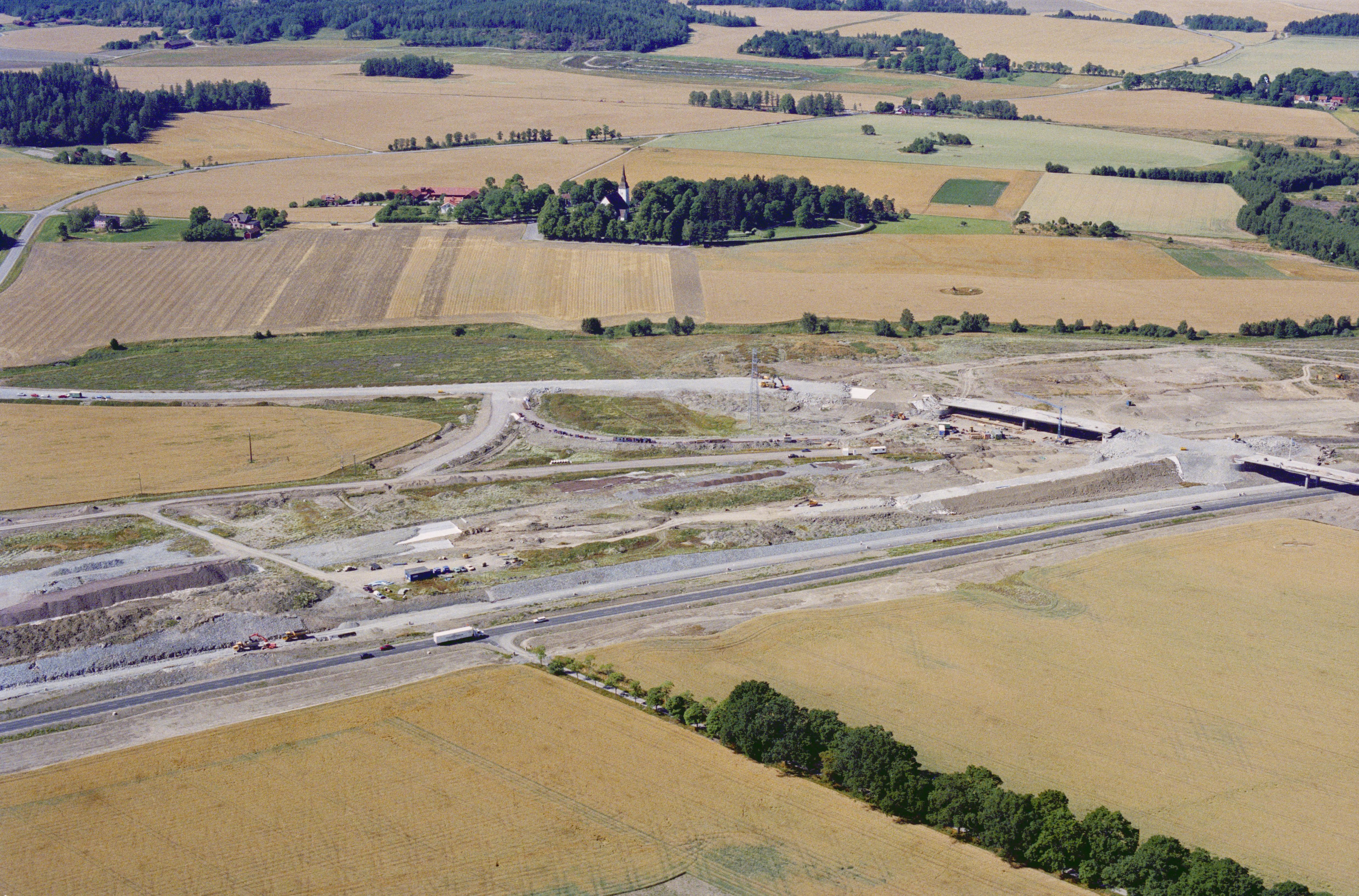 Beskrivning: Arkeologisk undersökning innan bygge av väg E20 norrost om Åkers kyrka (i bildens övre del) och Löta å. Grav- och boplatser RAÄnr Åker 271:1-2, 268:1, 282:1, 283:1, m.fl. vid bildens mitt. Bilden är tagen mot (väderstreck): V