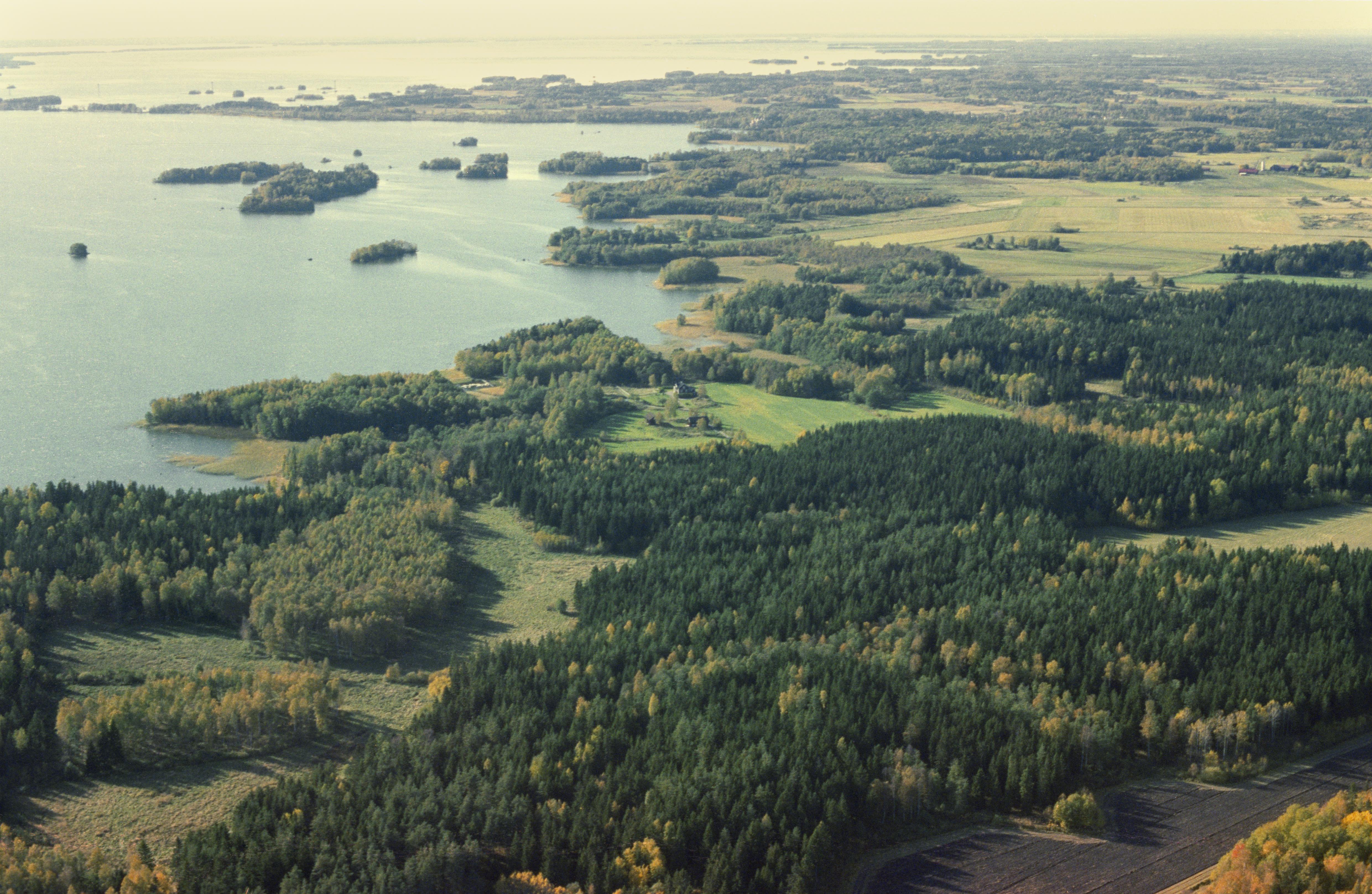Beskrivning: Vid bildens mitt Elovsnäs gård vid nordöstra delen av sjön Hjälmaren (Östra Hjälmaren). Bilden är tagen mot (väderstreck): V