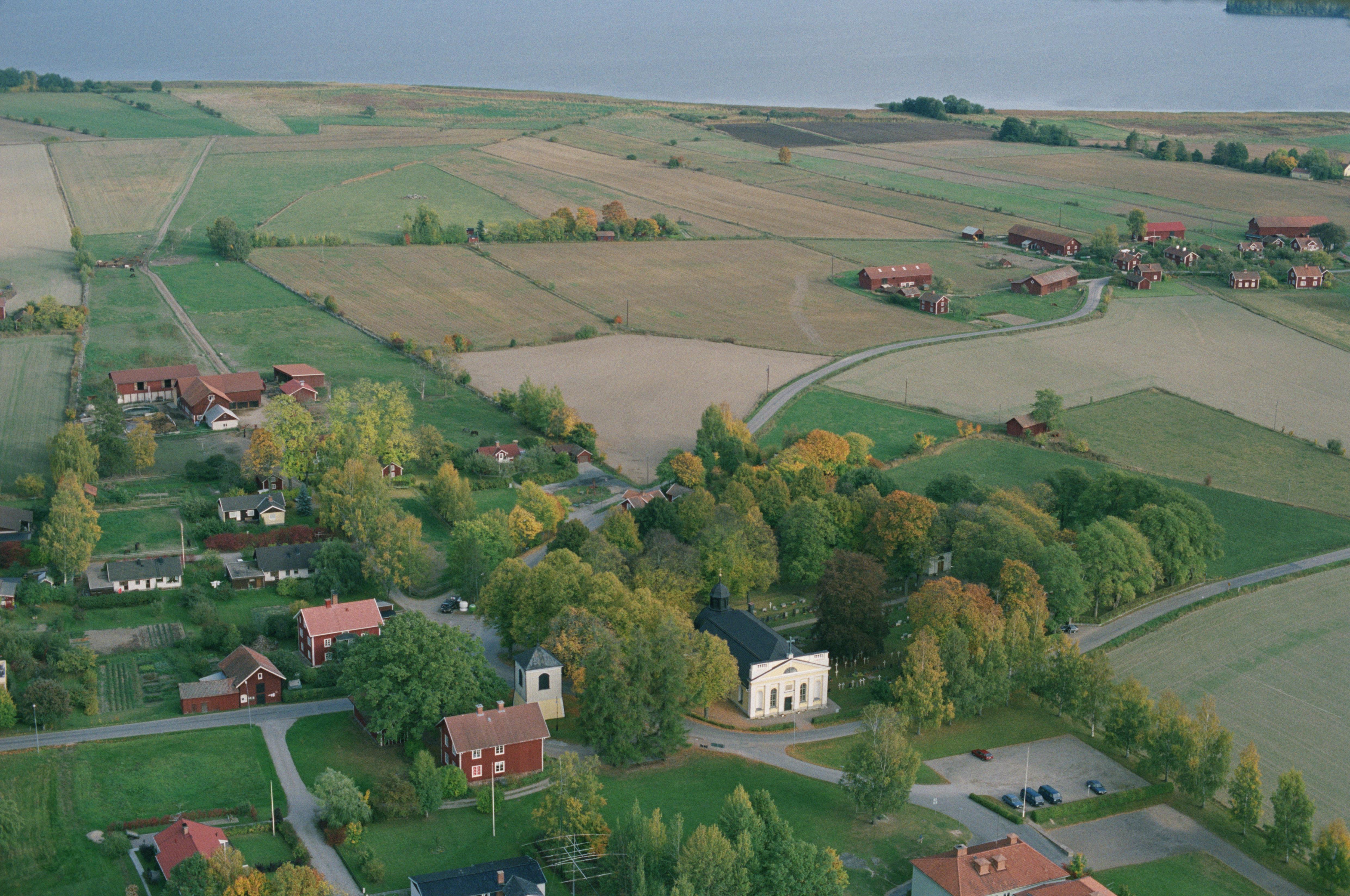 Beskrivning: Österåkers kyrka och kyrkby vid sjön Öljaren. Uppe till höger byn Hulla vid Gärsån. Bilden är tagen mot (väderstreck): OSO