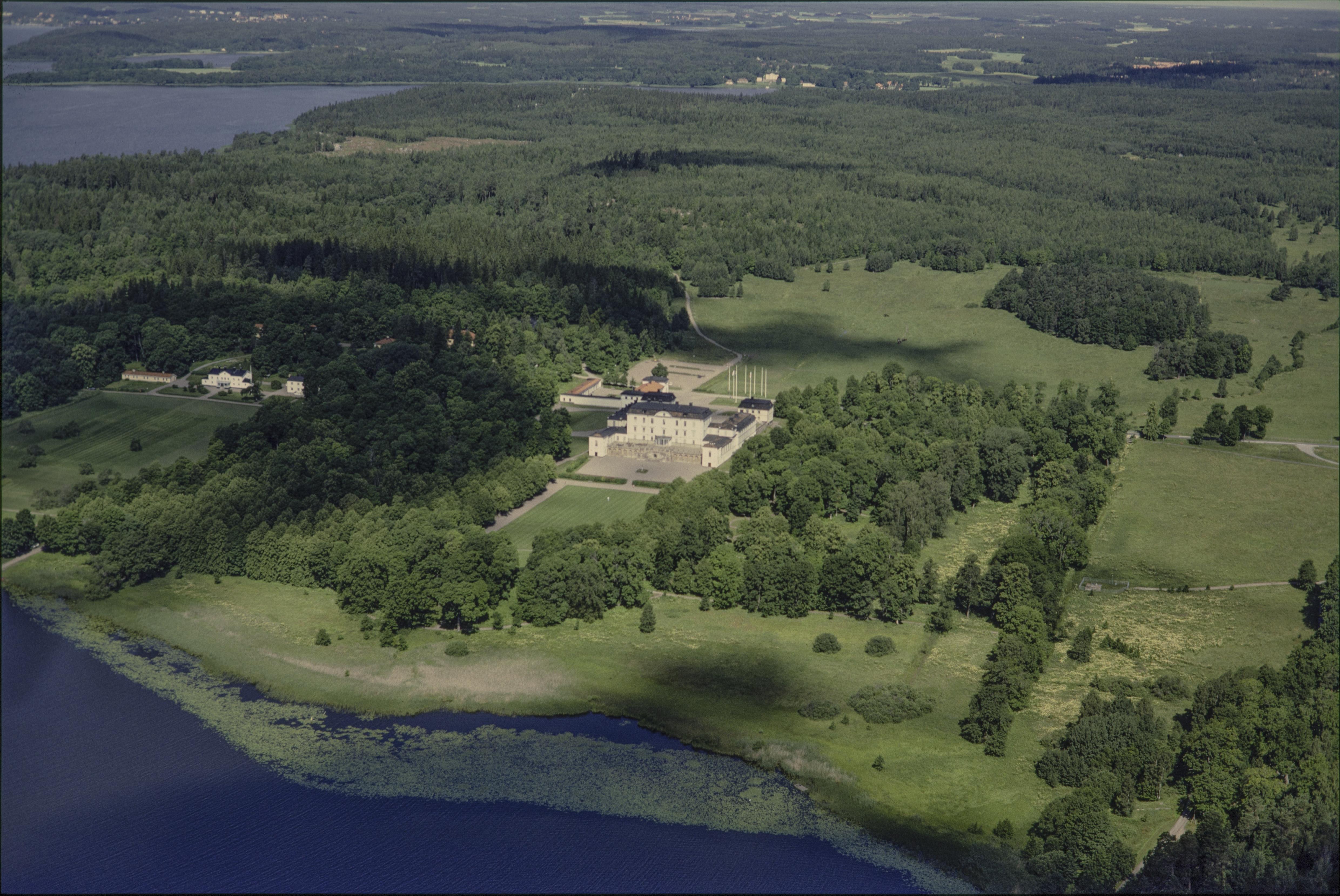 Beskrivning: Rosersbergs slott statligt byggnadsminne RAÄnr Norrsunda 77:1 vid Rosersbergsviken i Mälarens fjärd Skarven. Bilden är tagen mot (väderstreck): NV