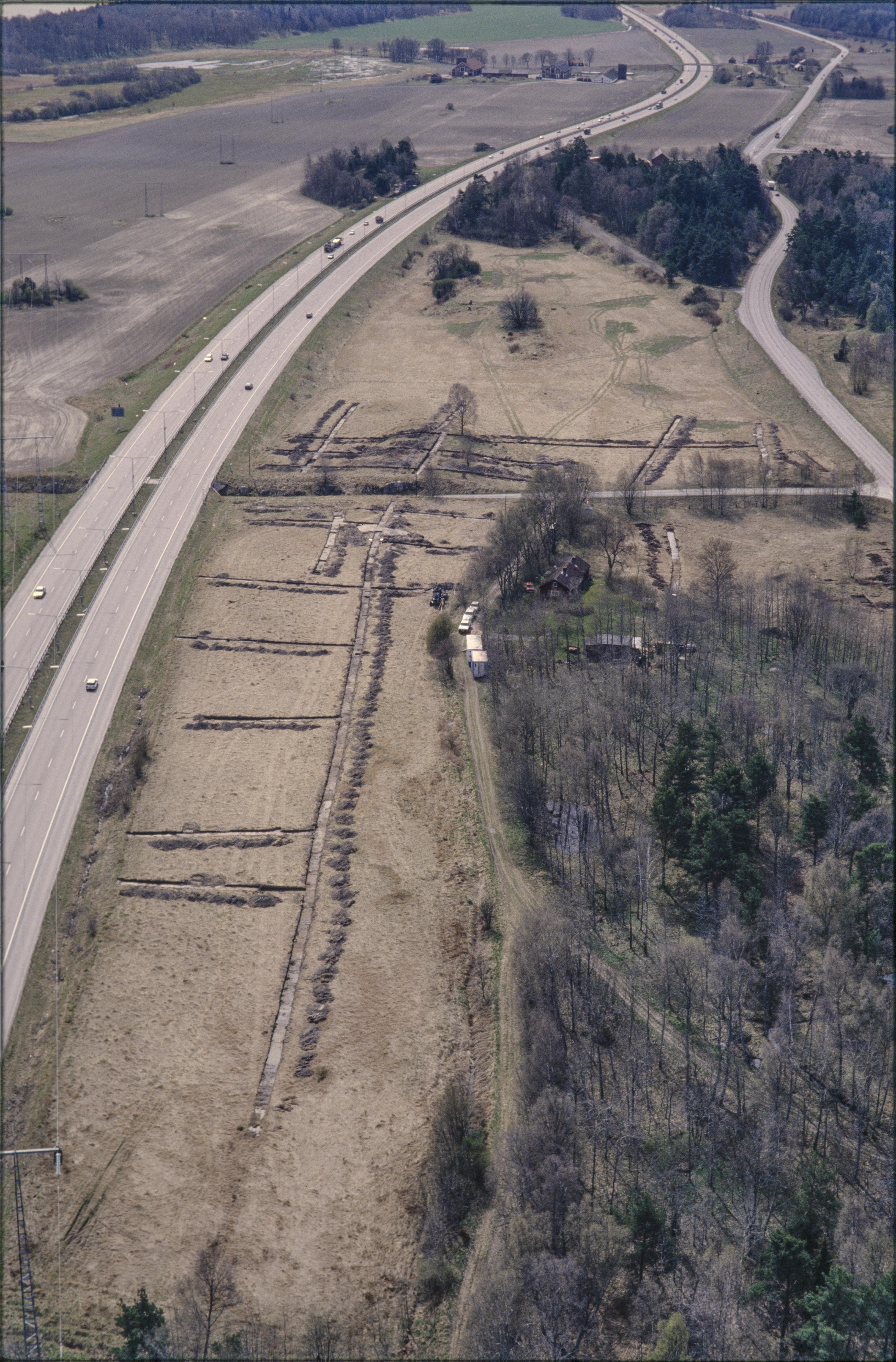 Beskrivning: Säby gamla tomt i östra delen av tätorten Rosersberg, Arkeologisk undersökning innan bygge av järnväg (Arlandabanan). Boplats RAÄnr Norrsunda 167:1 och gravfält Norrsunda 52:1. I bildens övre del gravfält RAÄnr Norrsunda 59:1 och boplats Norrsunda 165:1 m.fl. Bilden är tagen mot (väderstreck): S
