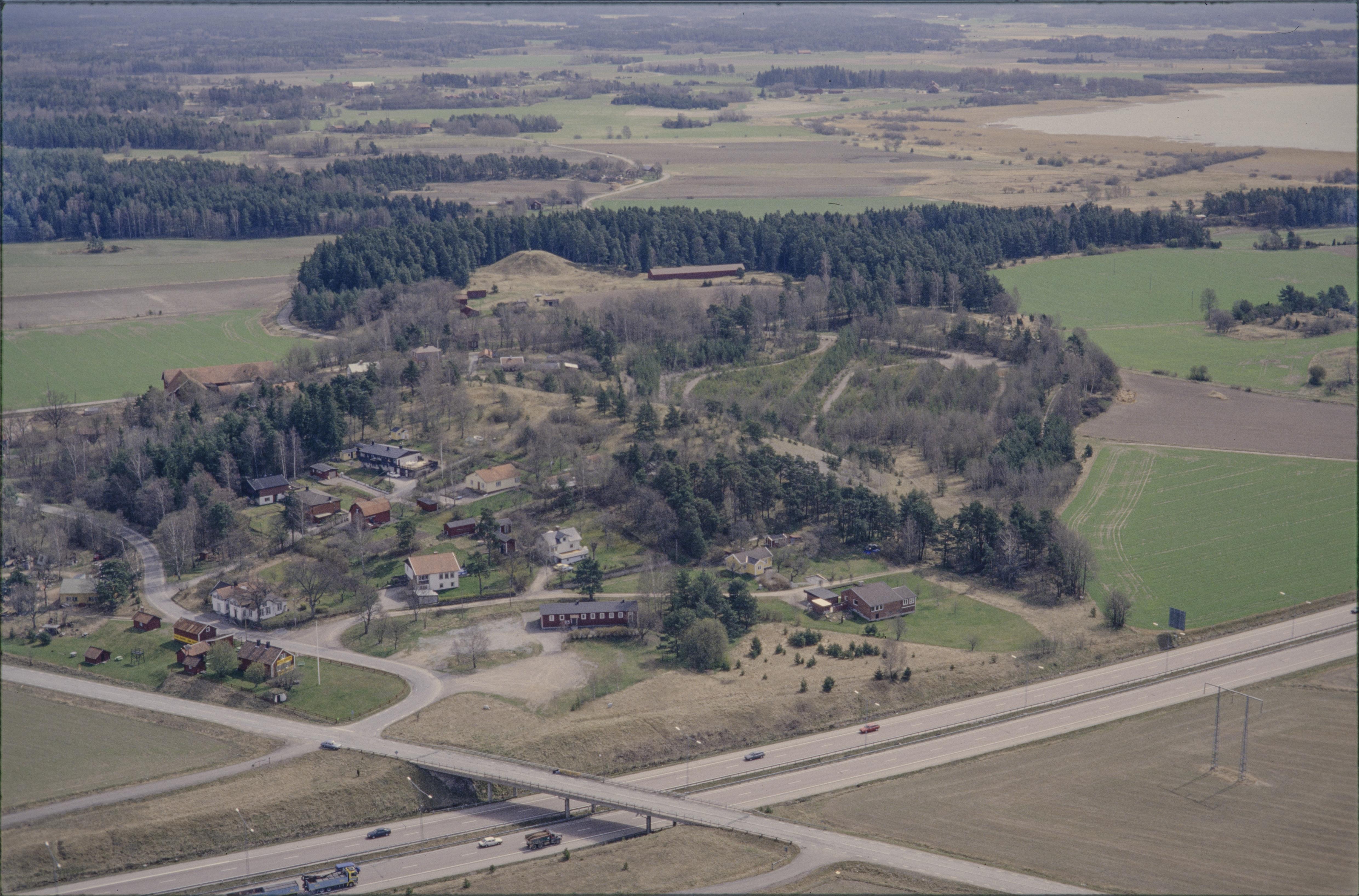 Beskrivning: Åshusby. Gravfält Nordians hög RAÄnr Norrsunda 31:1 över bildens mitt. Uppe till höger sjön Fysingen i Skånela socken. Bilden är tagen mot (väderstreck): OSO