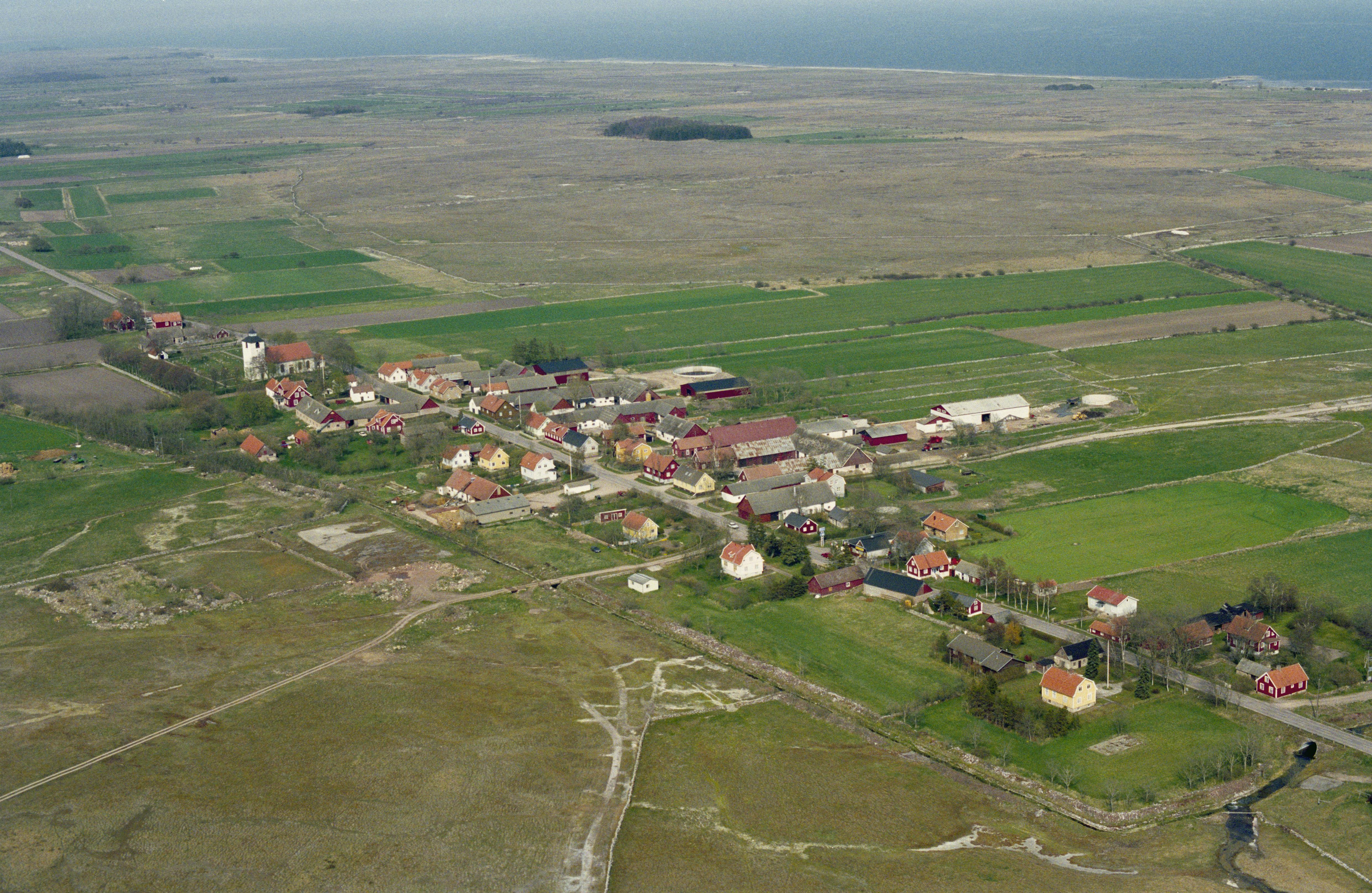 Beskrivning: Alvaret. Hulterstads kyrkby. Hulterstads kyrka till vänster. Bilden är tagen mot (väderstreck): NO