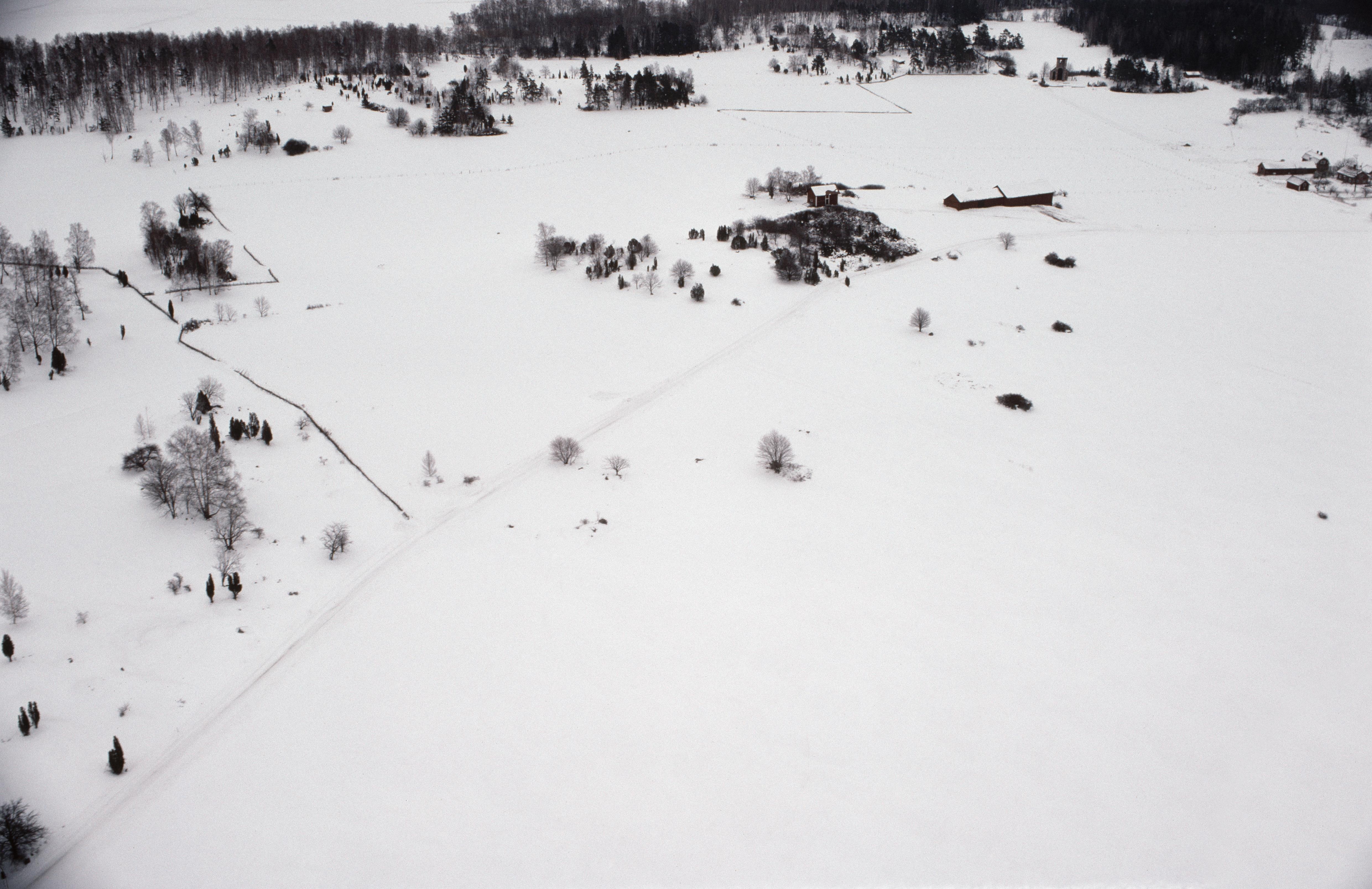 Beskrivning: Fornlämningsområdet Birka på Björkö i Mälaren. Vid bildens mitt gravfält Grindsbacka RAÄnr Adelsö 112:1. Till vänster sydöstra delen av gravfält Hemlanden RAÄnr Adelsö 118:1. Bilden är tagen mot (väderstreck): Ö