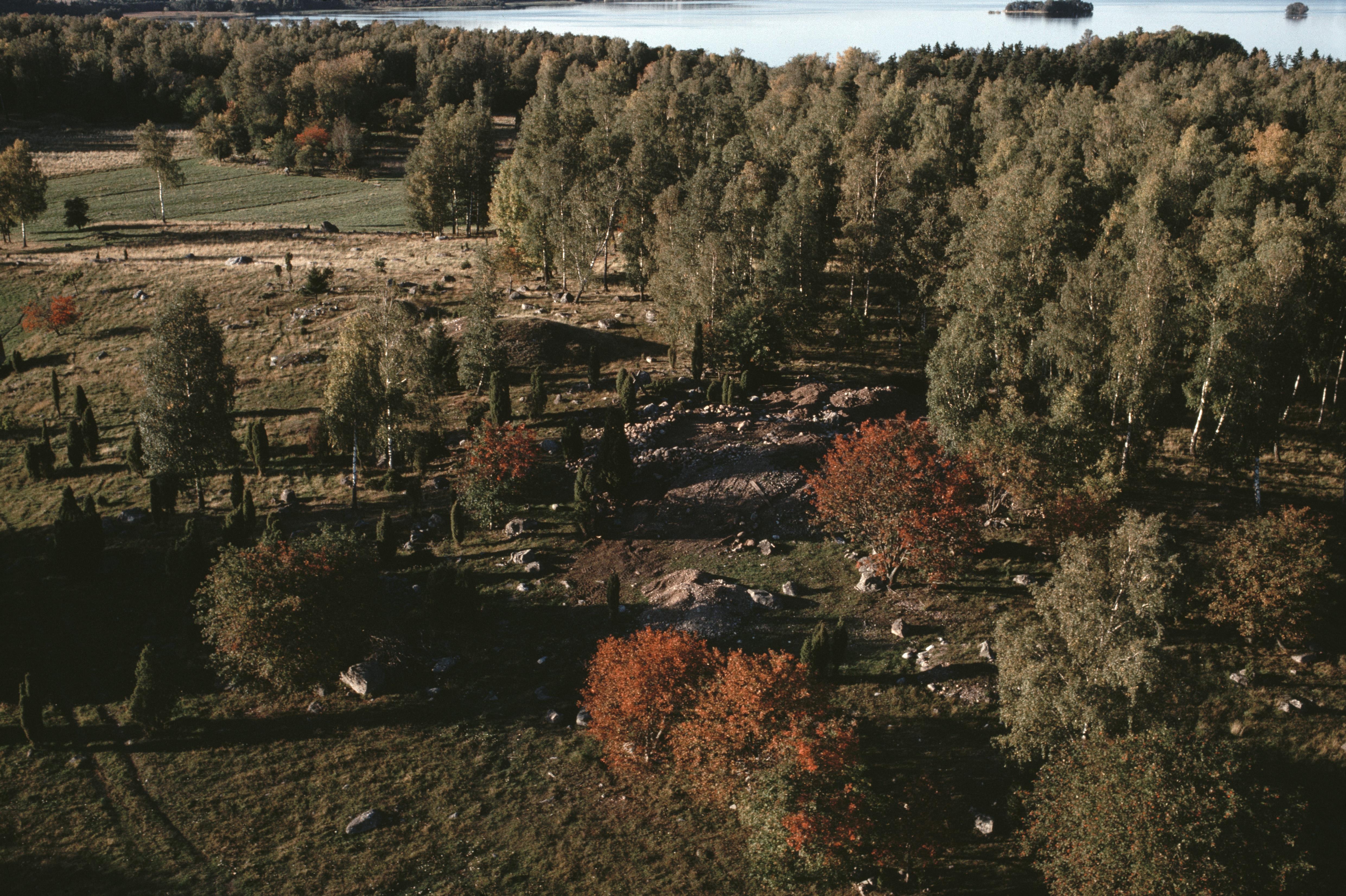 Beskrivning: Fornlämningsområdet Birka på Björkö i Mälaren. Fossil åker vid Ormknös RAÄnr Adelsö 137:1 och gravfält Adelsö 111:1 öster om Grindsbacka. Bilden är tagen mot (väderstreck): NV