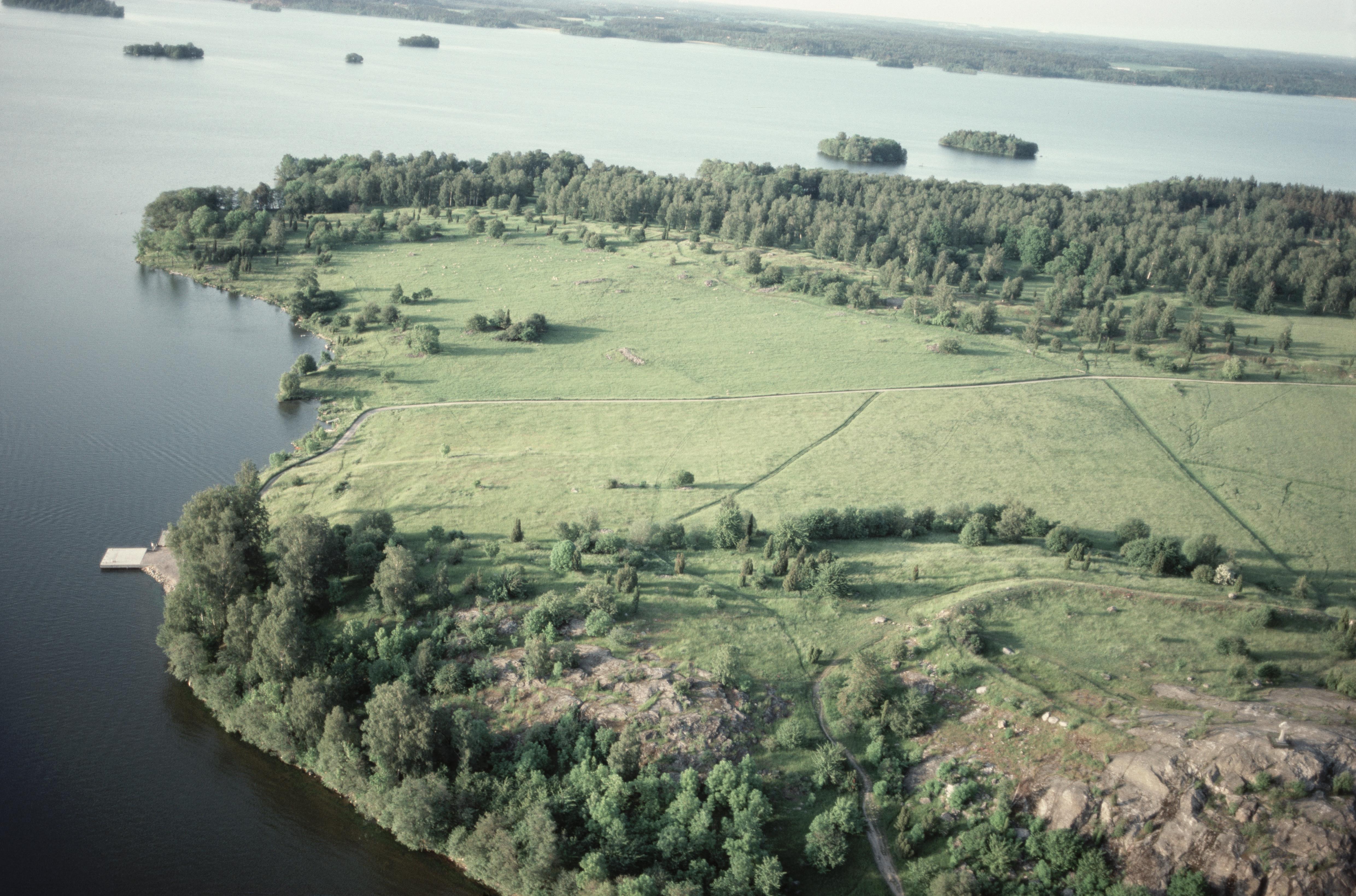 Beskrivning: Fornlämningsområdet Birka på Björkö i Mälaren. Norra delen av ön vid fornborg RAÄnr Adelsö 34:1, Hemlanden och Svarta jorden Adelsö 118:1 vid Stadsvallen Adelsö 119:1-2 m.fl. Bilden är tagen mot (väderstreck): NNO