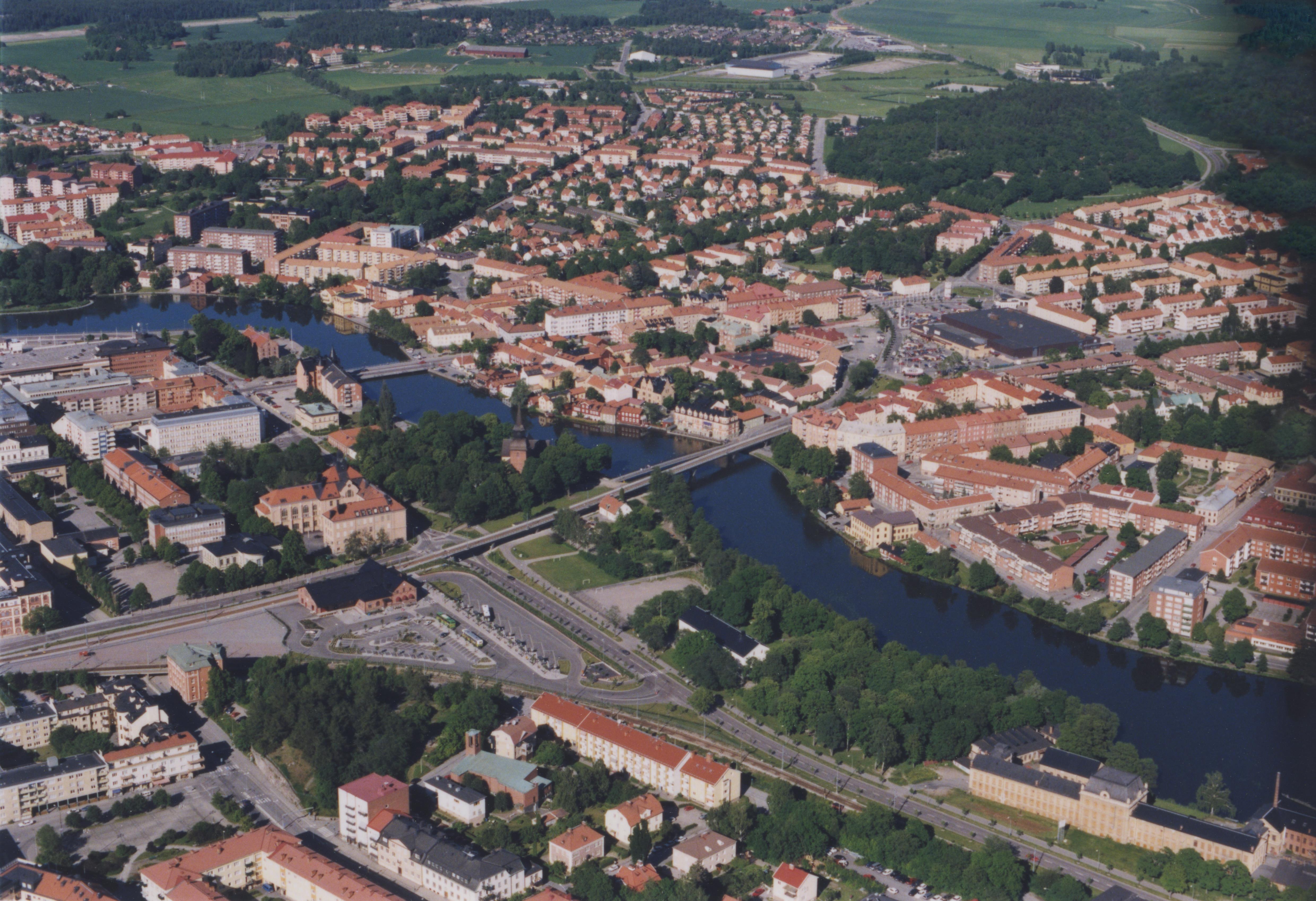 Beskrivning: Eskilstuna stad. Eskilstunaån. Fors kyrka och Gamla Staden vid bildens mitt. Bilden är tagen mot (väderstreck): NO
