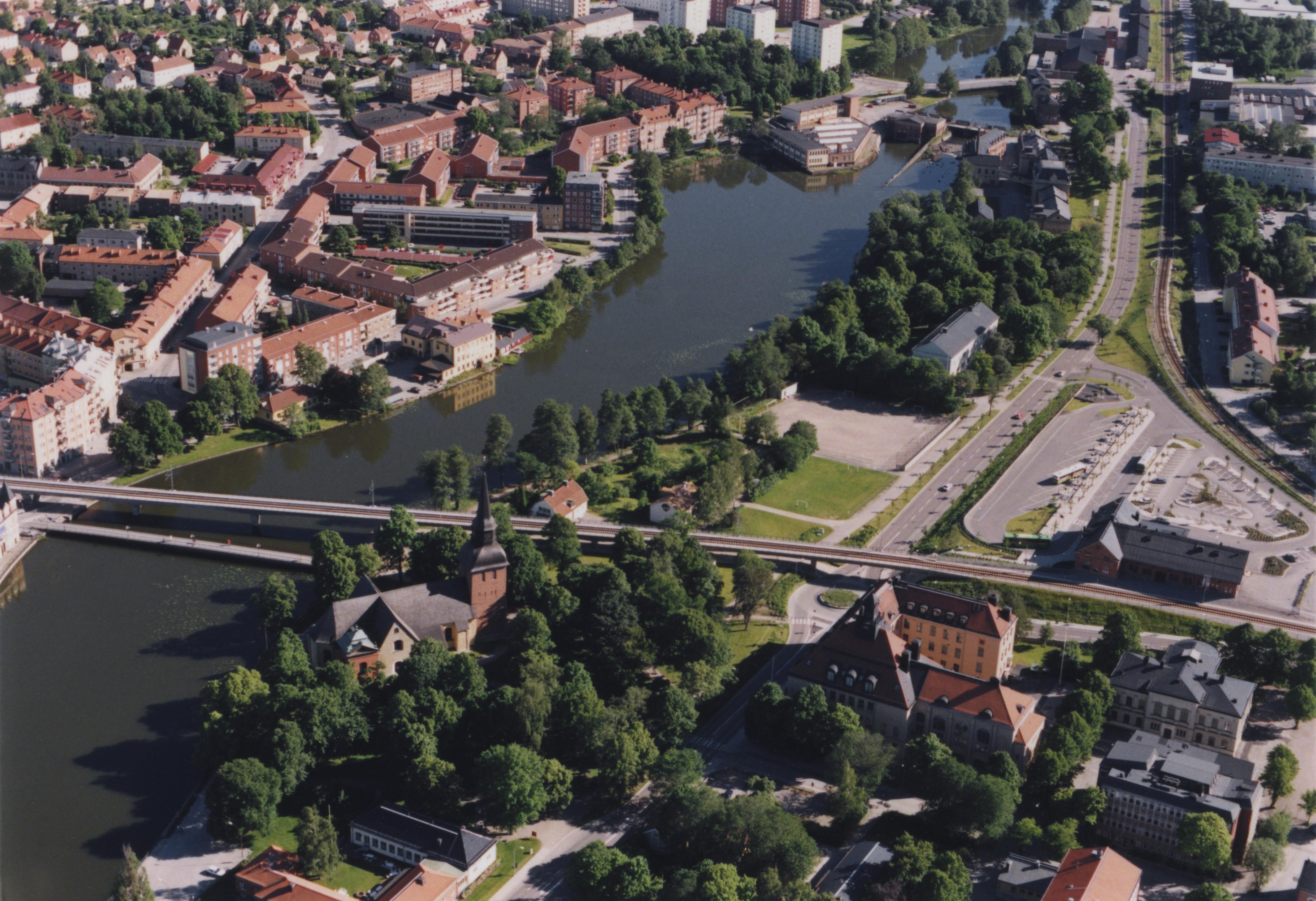 Beskrivning: Eskilstuna stad. Eskilstunaån. Fors kyrka nere till vänster. Bilden är tagen mot (väderstreck): S